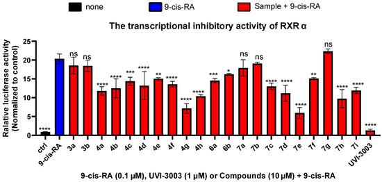 The RXRα transcriptional inhibitory activity of 21 benzothiazole derivatives. * indicates a statistically significant difference compared to the 9-cis-RA group, p < 0.05, p < 0.01 (**), p < 0.001 (***), p < 0.0001 (****).
