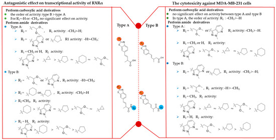 For type B compounds, the SAR were discussed as follows: When R2 was 1,1-dimethoxyethyl or 1-methyl-1H-pyrazolo[3,4-b] pyridy, compounds with R1 = H were more potent than those with R1 = CH3 (i.e., 7f > 7i, 7h > 7i). When R2 was cyclohexyl or cyclopentyl, the CH3 substitution at R1 resulted in more potent RXRα transcriptional inhibition activity compared to the compounds with R1 = H (i.e., 7c > 7b, 7e > 7d). When R1 = CH3, the activity order of R2 was cyclohexyl > cyclopentyl ≈ 1-methyl-1H-pyrazolo[3,4-b] pyridyl > cyclopropyl ≈ 1,1-dimethoxyethyl (inferred from 7e > 7c ≈ 7i > 7a ≈ 7g). However, when R1 = H, the activity order of R2 was 1-methyl-1H-pyrazolo[3,4-b] pyridyl > cyclohexyl > 1,1-dimethoxyethyl > cyclopentyl (based on 7h > 7d > 7f > 7b).