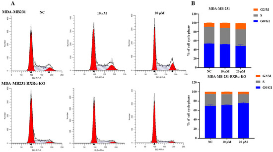 Based on the MTT cytotoxicity results, we aimed to investigate the potential mechanisms by which 7i inhibits MDA-MB-231 cells. Studies have demonstrated that the RXRα antagonist XS-060 and its derivates exert anti-proliferative activity against MDA-MB-231 cells by inducing G2/M phase arrest [5]. In our work, after treating MDA-MB-231 cells with 7i for 48 h, cell cycle distribution was analyzed. As a result (Figure 5A,B), 7i induced G2/M phase arrest in wild-type MDA-MB-231 cells at a concentration of 20 μM, with a statistically significant difference compared to the control group (p < 0.05). However, this G2/M phase arrest was abrogated when RXRα was knocked out, even in the presence of 7i. Specifically, in wild-type MDA-MB-231 cells, 7i treatment led to a significant increase in the proportion of G2/M phase cells, indicating that compound 7i can regulate the cell cycle and induce G2/M phase arrest to inhibit the proliferation of MDA-MB-231 cells. In contrast, a significant decrease in the proportion of G2/M phase cells was observed in RXRα-knocked-out MDA-MB-231-cells, suggesting that the induction of G2/M phase arrest by 7i was dependent on RXRα.