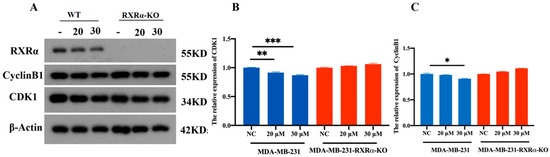 The effects of 7i on the expression levels of Cyclin B1 and CDK1, detected by Western blot. (A) MDA-MB 231 cells and RXRα-KO MDA-MB 231 cells were treated with 7i (20 μM and 30 μM) and 0.1% DMSO (NC group) for 36 h and analyzed by immunoblotting. (B) The grayscale analysis bar chart of CDK1 protein expression in MDA-MB 231 cells and RXRα KO MDA-MB 231 cells. (C) The grayscale analysis bar chart of Cyclin B1 protein expression in MDA-MB 231 cells and RXRα KO MDA-MB-231 cells. * indicates statistical significance, p < 0.05, p < 0.01 (**), p < 0.001 (***).