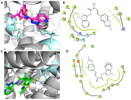 Molecular docking is a computational simulation technique used to predict interactions between molecules (e.g., proteins and ligands) and identify potential target proteins of compounds, which is widely applied in drug discovery and development [18,19]. The above results demonstrated that 7i inhibited the proliferation of MDA-MB-231 cells in an RXRα-dependent manner. Therefore, 7i exerts its anti-tumor activity by binding to RXRα. Compound 7i is a pair of racemic mixtures (R-7i and S-7i) with one chiral center. We performed molecular docking studies to evaluate the binding abilities of R-7i and S-7i to RXRα, respectively. As shown in Figure 8, R-7i and S-7i could bind to RXRα by pi–pi interaction between Trp305 and benzothiazole nucleus, which is similar to meroterpenthiazole A (Figure 8A–D). Moreover, the introduction of a pyrazolo[3,4-b] pyridine moiety into the benzothiazole side chain provided an additional pi–pi interaction between R-7i and RXRα, which enhanced the binding affinity (Figure 8A,B). Both R-7i and S-7i exhibit hydrophobic interactions (Figure 8A–D).