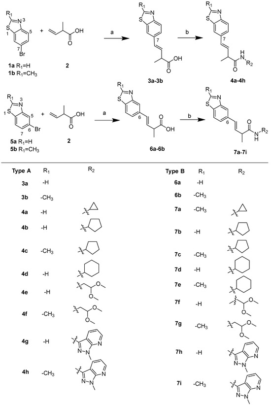 Two series of benzothiazole derivatives (A and B) were synthesized as depicted in Scheme 1. Firstly, commercially available 7-bromo-1,3-benzothiazole (1a) or 7-bromo-2-methylbenthiazole (1b) reacted with 2-methylbut-3-enoic acid (2) at room temperature for 24 h to afford 3a–3b. This process involves the Mizoroki–Heck reaction performed using Pd (OAc)2 as the catalyst, tri-ortho-tolylphosphine as the stabilizing ligand, triethylamine (TEA, 0.1 equiv) as the base to facilitate the palladium catalytic cycle, and a 3:1 (v/v) mixture of 1,4-dioxane/water as the solvent system. Following the above reaction conditions, compounds 6a and 6b were synthesized from 6-bromo-1,3-benzothiazole (5a) and 6-bromo-2-methylbenzothiazole (5b), respectively, using 2-methylbut-3-enoic acid (2) as a common substrate. Further amidations were conducted at the carboxyl group on the benzothiazole side chain using acetonitrile as the solvent. The reactions were carried out with N-methylimidazole (NMI) and N, N, N′, N′-tetramethylchloroformamidinium hexafluorophosphate (TCFH) as activating agents, in the presence of various substituted amines.