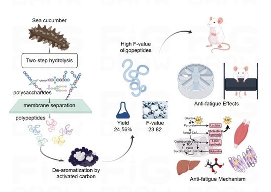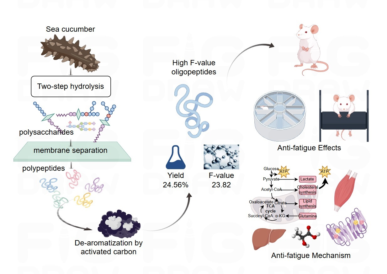 Supplementary Table S1). This finding suggests that activated carbon is highly effective in removing aromatic groups. Subsequent to activated carbon adsorption, the F-value of the amino acid composition exhibited a substantial increase, with the F-value attaining 23.82 after adsorption, thereby satisfying the criteria for HFO (F-value > 20). Branched-chain amino acids (BCAAs) are a class of amino acids that have been identified as being particularly important for athletes and fitness enthusiasts. Among these BCAAs, leucine, isoleucine, and valine have been found to promote muscle synthesis, aid in muscle repair and growth, and are of particular importance in these contexts. Furthermore, BCAAs have been demonstrated to reduce fatigue during exercise, enhance endurance, and improve athletic performance. These substances have also been demonstrated to alleviate muscle soreness and accelerate recovery. The yield of HFO from sea cucumbers was measured to be 24.56% through validated testing. The amino acid residue sequence analysis results for HFO are shown in