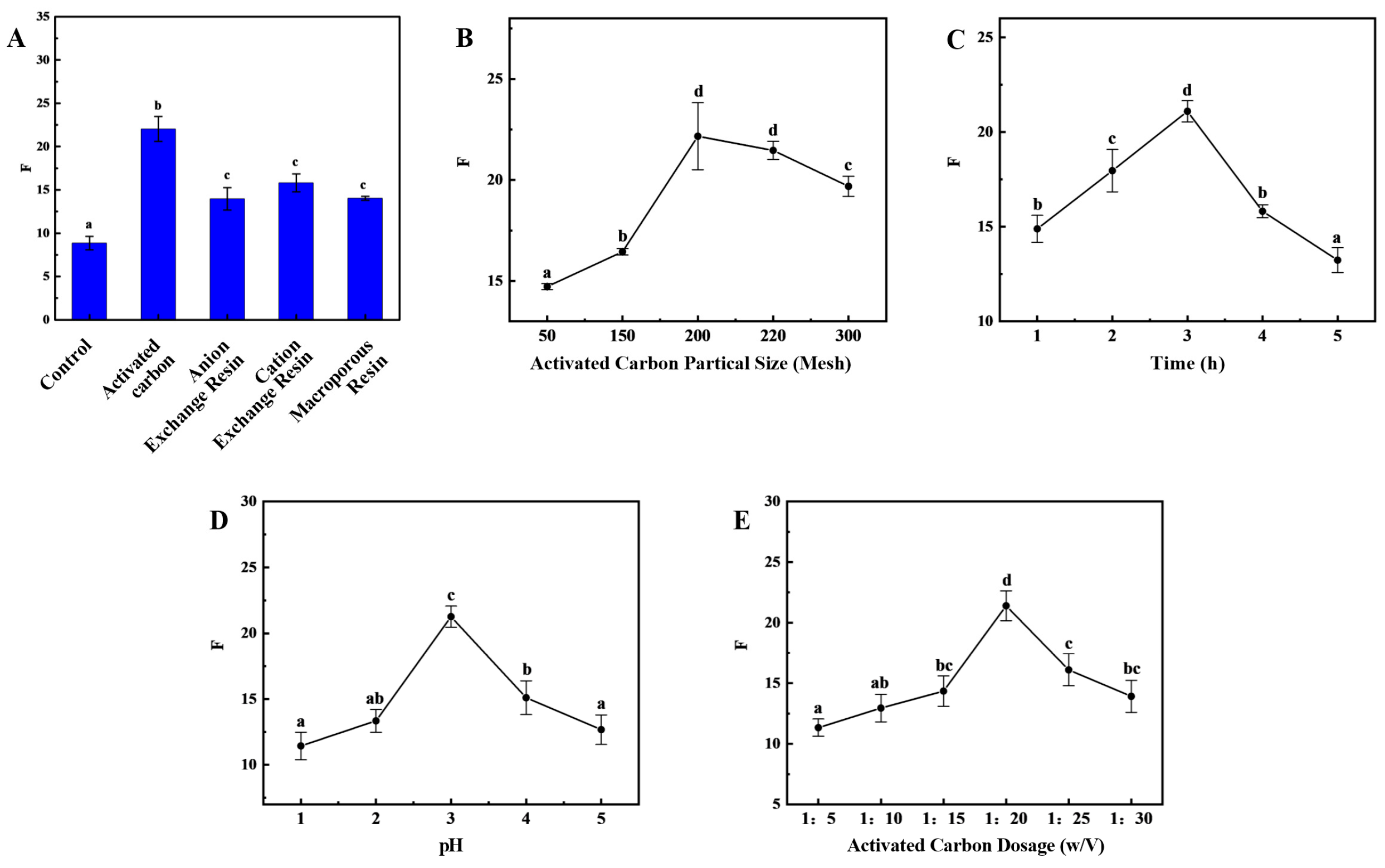 Figure 3A). The activated carbon demonstrated the most effective adsorption performance of the four adsorbents, exhibiting an OD220/OD280 ratio of 22.03 ± 1.43.