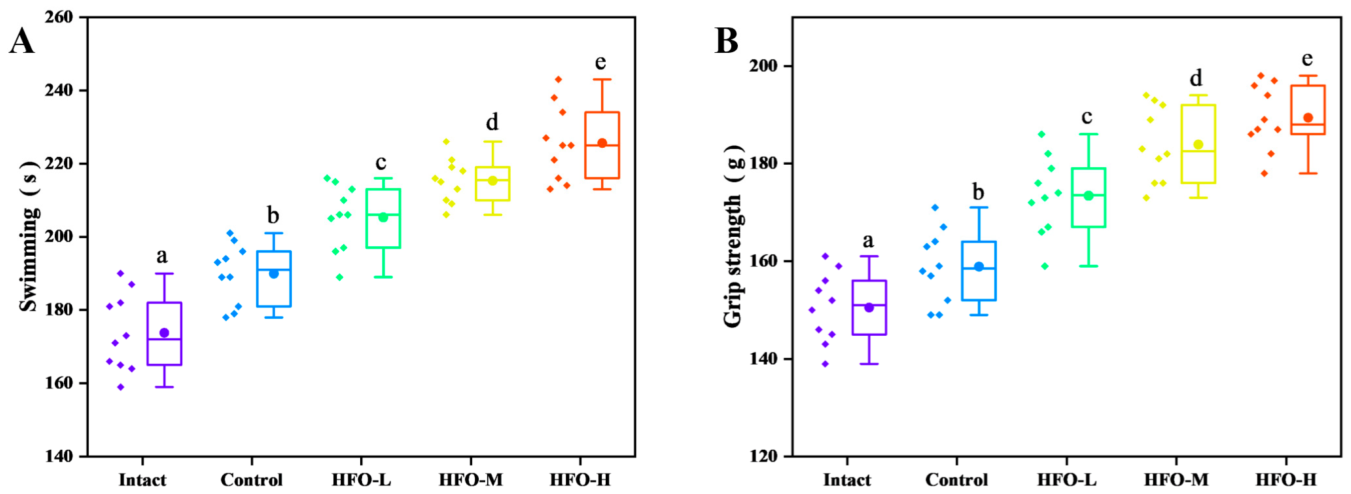 Figure 6A), following exhaustive swimming, the lactic acid levels in the HFO group were significantly lower than those in the control group. The reduction in lactic acid levels exhibited a dose-dependent relationship. Furthermore, during periods of strenuous physical activity, if the body experiences a deficiency in glucose supplementation for an extended duration, it will begin to break down proteins to maintain essential bodily functions. Urea, the final product of protein metabolism, accumulates in significant quantities within the body during prolonged endurance exercise. Given the established negative correlation between urea nitrogen levels and exercise endurance, it can be concluded that an improvement in exercise tolerance is associated with reduced urea nitrogen levels. Consequently, the reduction in urea nitrogen levels in the body is of paramount importance for enhancing fatigue resistance [
