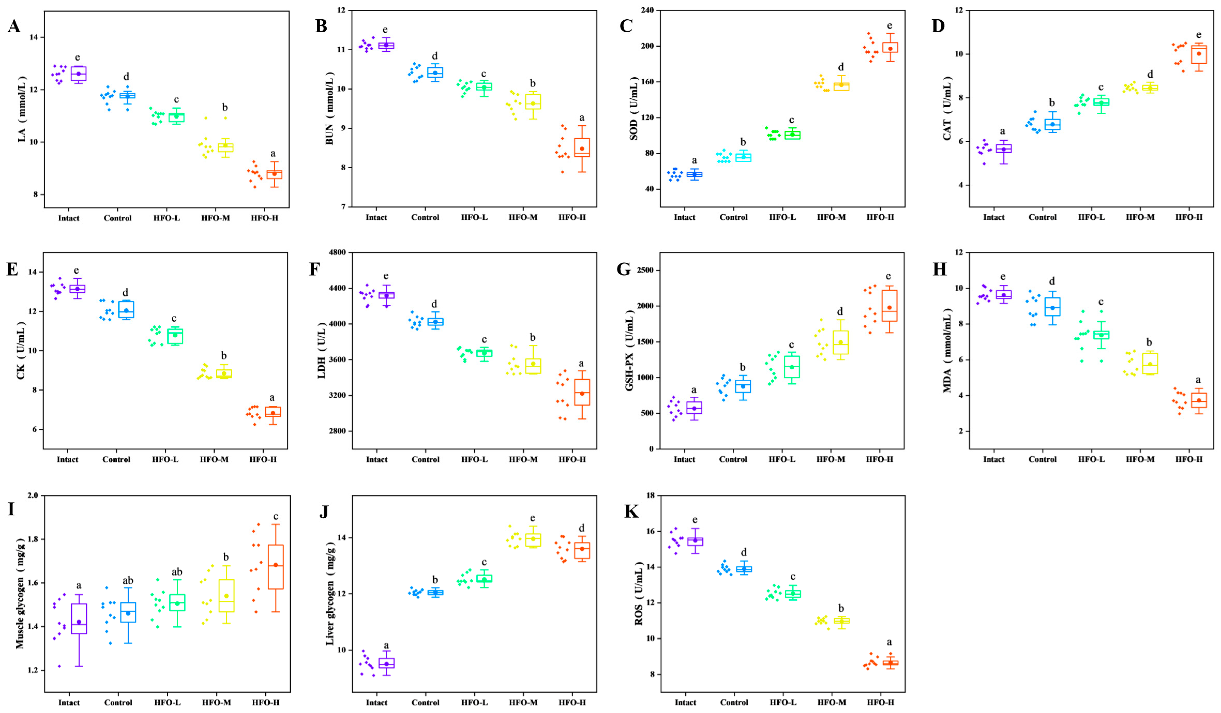 Figure 6I, the muscle glycogen content in the HFO low-, medium-, and high-dose groups exceeded that of the control group, thereby indicating that HFO promote glycogen accumulation in the body, with the high-dose group exhibiting the optimal effect. In comparison with the control group, the muscle glycogen content in the HFO low-, medium-, and high-dose groups exhibited increases of 5.63%, 8.45%, and 18.31%, respectively, in relation to the control group. These increases were found to be statistically significant. The medium-dose and high-dose groups exhibited significant differences in comparison with the control group. As illustrated in