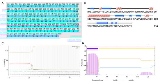 ORF70 of MaMV-DC has been identified as a putative holin-like protein. The ORF70 gene was 405 bp in length and encodes a protein of 134 amino acids (aa), with a calculated molecular mass of 15.4 kDa and a theoretical isoelectric point (pI) of 5.86. Secondary structure analysis of the ORF70 protein reveals the presence of four α-helices and eight β-strands (Figure 1B). According to SignalP 4.0 software, ORF70 lacks a signal peptide (Figure 1C). Structural predictions further suggest that ORF70 contains a single hydrophobic transmembrane domain (TMD) and an extracellular C-terminal region, with the transmembrane helix spanning residues 2–24 (Figure 1D). Based on its predicted structural characteristics, ORF70 was considered a holin-like protein with features consistent with class III holins.
