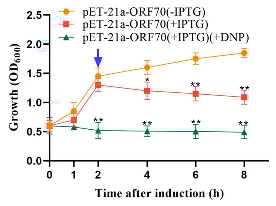 Effect of 2,4-dinitrophenol (DNP) on the growth of DE3: pET-21a-ORF70. After 25 min of IPTG induction, DNP was added to a final concentration of 10 mmol/L. The blue arrow indicates that DNP triggers ORF70 induced depolarization of the cell membrane 2 h in advance. The orange line represents the uninduced DE3: pET-21a-ORF70 (–IPTG), the red line represents the IPTG-induced DE3: pET-21a-ORF70 without DNP (+IPTG), and the green line represents the IPTG-induced DE3: pET-21a-ORF70 with DNP (+IPTG, +DNP). Expression of ORF70 results in growth inhibition of E. coli, which occurs earlier and is more pronounced in the presence of DNP. The “*” (T-test, p < 0. 05) and “**” indicates statistical significance (T-test, p < 0. 01).