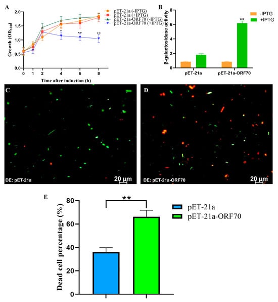 Effect of ORF70 on the growth activity of E. coli. (A) The growth curves of induced and uninduced strains (DE3: pET-21a and DE3: pET-21a-ORF70). (B) The β-galactosidase activity was determined for extracellular supernatant from induced strains. (C) Fluorescent staining of induced DE3: pET-21a. (D) Fluorescent staining of induced DE3: pET-21a-ORF70. The cells with green fluorescence represent living bacterial cells, and those with red fluorescence represent dead cells. (E) The percentage of dead cells of different E. coli strains. The “*” (T-test, p < 0. 05) and “**” indicates statistical significance (T-test, p < 0. 01).