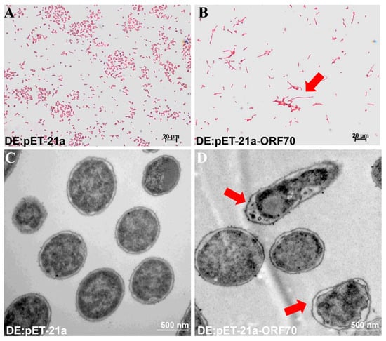 Effect of ORF70 on E. coli cell morphology. (A) Gram staining of induced DE3: pET-21a. (B) Gram staining of induced DE3: pET-21a-ORF70. (C) Induced DE3: pET-21a under TEM. (D) Induced DE3: pET-21a-ORF70 under TEM. Red arrows in panels (B,D) indicate morphological changes.