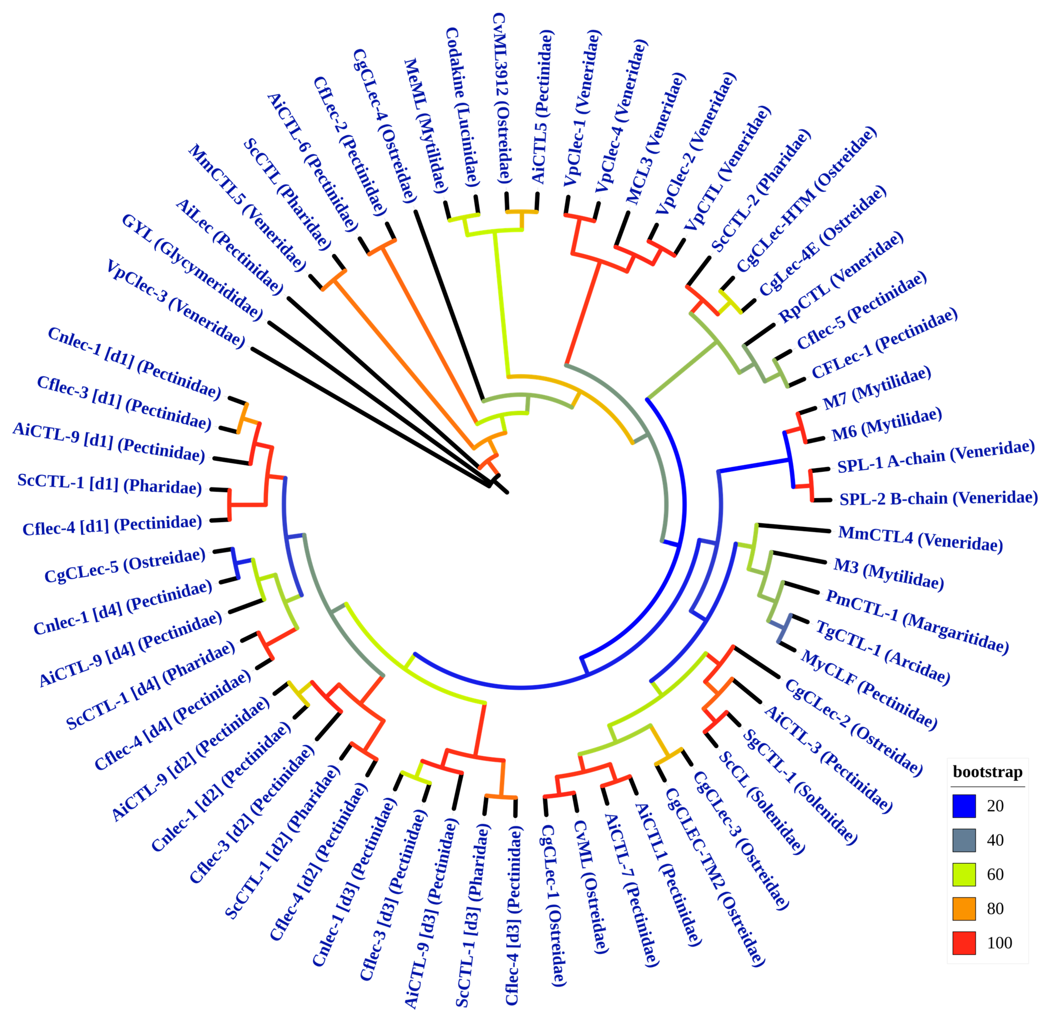 - Saco, A.; Suárez, H.; Novoa, B.; Figueras, A. A Genomic and Transcriptomic Analysis of the C-Type Lectin Gene Family Reveals Highly Expanded and Diversified Repertoires in Bivalves. Mar. Drugs 2023, 21, 254. [Google Scholar] [CrossRef]