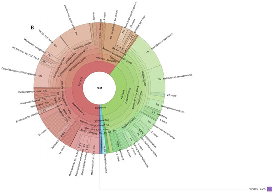 At low-salinity conditions, bacteria constituted the vast majority of microbial communities, representing approximately 86% of total diversity (Figure 2A). In this environment, cyanobacteria (26%) and Rhodobacterales (23%) belonging to Alphaproteobacteria stand out as the dominant taxa. In addition, Alteromonadales (11%), Vibrionales (3%), and Chromatiales (1%) from the Gammaproteobacteria subphyla were found in significant proportions. Furthermore, phyla such as Actinobacteriota (7%) and Bacteroidota (7%) also constituted a significant portion of the community. Archaeal communities were represented at a limited level in the low-salinity environment. In particular, the Halobacteria group reached only 4%. Eukaryota members were identified as only a small fraction (2–3%).