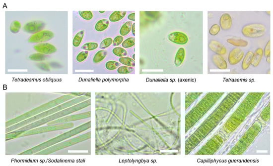 Microscopy images of algal (A) and cyanobacterial (B) species isolated from Sečovlje salt pans. Representative cells were imaged by Primo star (Zeiss). Scale bar corresponds to 10 μm.