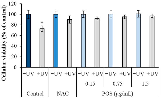 Effect of POS on cell viability in UV-irradiated HS-68 fibroblasts. Cells were pretreated with POS (0.15, 0.75, and 1.5 µg/mL) for 24 h and then exposed to UV radiation (105 erg/mm2/sec) for 5 min per days over three consecutive days. Cell viability was determined using the MTT assay. Data are expressed as mean ± SEM (n = 6). (*) Statistically significant differences (ANOVA, p < 0.05) compared to control.