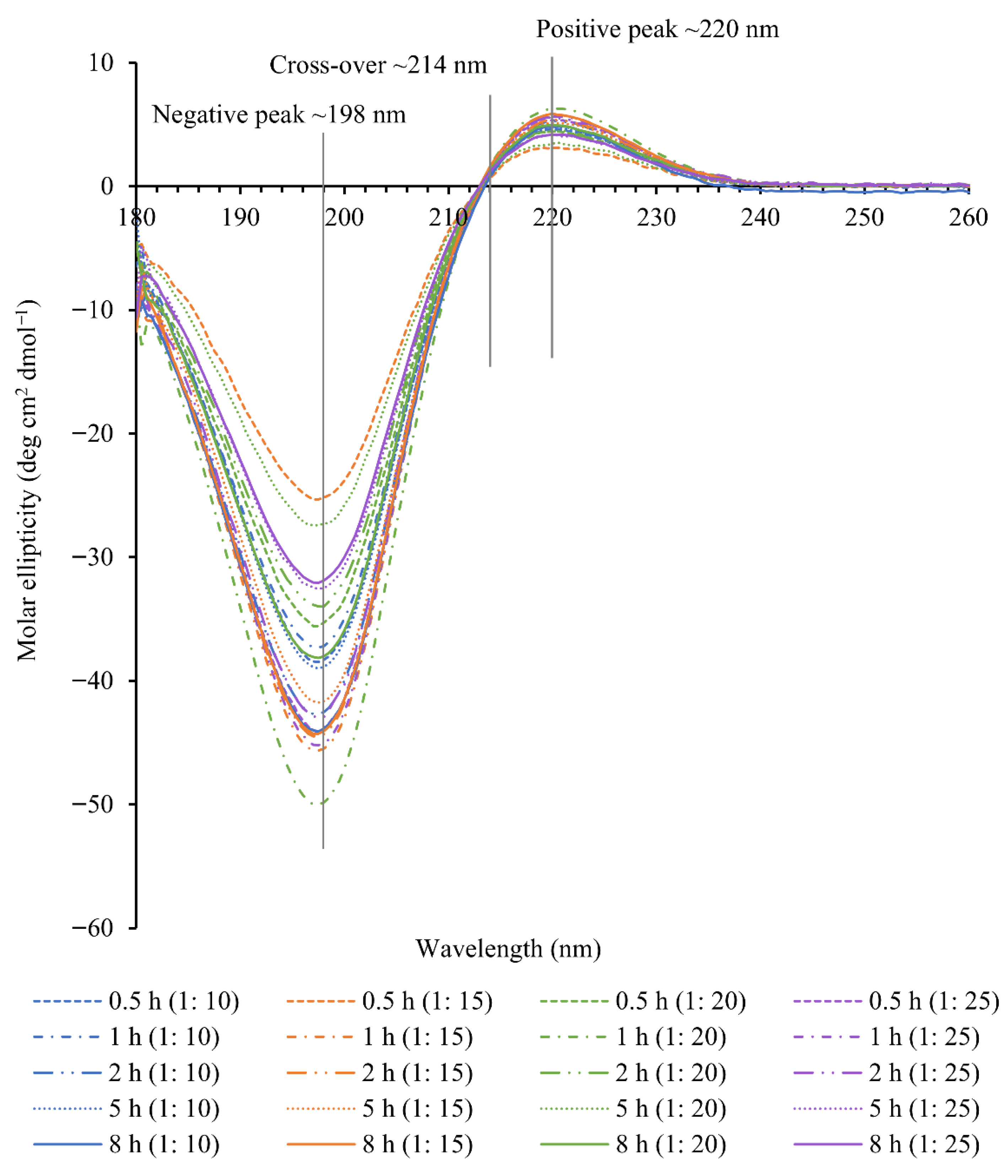 | Time (h) | m/v Ratio | Absorption Ratio by FTIR | Rpn Ratio by CD | Onset Temperature (°C) | Denaturation Temperature (°C) | Enthalpy of Denaturation (J/g) |