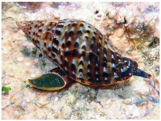 Pisania pusio (Linnaeus, 1758). Occurrence data accessed through GBIF (GBIF Ocurrence Download https://www.inaturalist.org/observations/197986153, accessed on 20 May 2025). Original, unmodified photograph taken in Saint Kitts and Nevis by pkondrashov (https://www.inaturalist.org/photos/348849010, accessed on 20 May 2025, licensed under http://creativecommons.org/licenses/by-nc/4.0/). The species used in this study is not endangered and is widely distributed in the region.