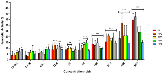 Percentage of hemolytic activity of PP peptides in hRBC determined by hemoglobin release. A range of peptide concentrations (1.5625–800 μM) was evaluated against hRBC for 2 h. Phosphate-buffered saline (PBS) and Triton X-100 at 1% were used as negative (0% hemolysis) and positive controls (100% hemolysis), respectively. The results are representative of three independent experiments, analyzed via one-way ANOVA with α = 0.05 to assess the differences between the peptide concentrations and the negative control (* p < 0.05, ** p < 0.01, and *** p < 0.001).