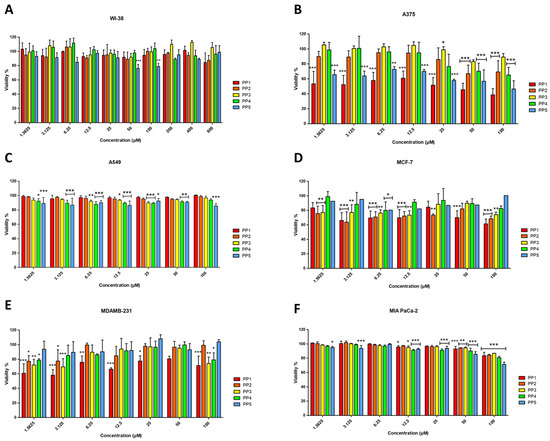 Effects of PP peptides on cell viability of fetal lung fibroblasts WI-38 (A), malignant melanoma A375 (B), epithelial cell lung carcinoma A549 (C), luminal A breast adenocarcinoma MCF-7 (D), triple negative basal breast adenocarcinoma MDA-MB-231 (E), and pancreatic carcinoma MIA PaCa-2 (F), determined by resazurin reduction assay at 24 h of incubation. Cells treated with culture medium served as the negative control (100% viability), while cells treated with 1% Triton X-100 served as the positive control. The results shown are representative of three independent experiments and were analyzed using one-way ANOVA with α = 0.05 to assess differences between peptide concentrations and the negative control for each cell line (* p < 0.05, ** p < 0.01, and *** p < 0.001).
