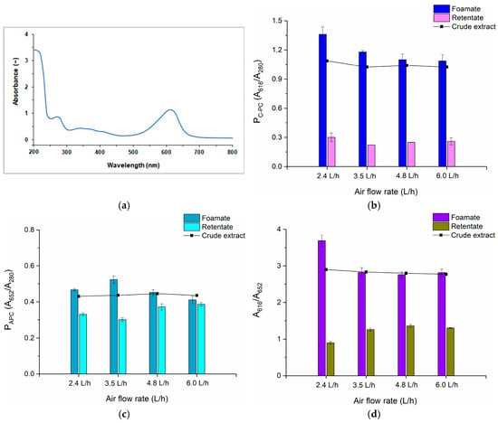 The experimental results show that with the higher air flow rate, the volume of foamate collected grew, so the degree of volume reduction decreased and, at the same time, the concentration of C-PC in the foamate decreased. Almost sevenfold volume reduction with the volume of concentrate of 18 mL at a flow rate of 2.4 L/h was observed, while at an air flow rate of 6.0 L/h, the reduction was only 1.5 and the amount of foam condensate increased to 67 mL, and it was visibly diluted. The highest C-PC concentration in the foamate, equal to 1.15 mg/mL, was obtained at an air flow rate of 2.4 L/h, with an initial C-PC concentration in the crude extract of 0.28 mg/mL. In Figure 1a the absorption spectrum of the crude extract of PBPs is presented, from which C-PC was identified in the wavelength of 616 nm and APC of 652 nm.
