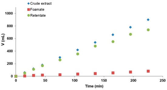 In the following processes there were two kinds of products: foamate collected periodically in the form of foam condensate and retentate. Therefore, the total volume of them should be equal to the volume of crude extract supplied to the column. In reality, due to the losses of solution in the column, this was not possible to achieve. However, the observed losses were rather low and constant, so that the proportions of the quantities of the products obtained in relation to the crude extract remained stable. The residence time was 25 min for the flow rates of extract and retentate of 4 mL/min and was extended to 50 min for flow rates of 2 mL/min. In the following graph (Figure 4) the three discussed streams of crude extract, foamate, and retentate for experiment no. 6 (air flow rate of 4.8 L/h and pump flow rates of 4 mL/min) are presented.