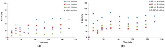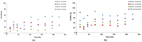 In processes 3–5, after 150 min from the beginning, the purities of C-PC in the foamates were at a similar level and amounted to approximately 1.3 (Figure 5a). The obtained values were similar to those obtained in the batch process at an air flow rate of 2.4 L/h except in process six (4.8 L/h and 4 mL/min), where the value of C-PC purity dropped to 0.9 after 200 min of the process. This was probably due to the most intensive mass transfer phenomenon, with a large amount of diluted foam flowing into the receiver. That is why in this variant, the highest C-PC recovery of approximately 60% was achieved while at the same air flow rate but with half as low flow rates on the pumps (experiment 5), the C-PC recovery in the condensate was the lowest and did not exceed 20%. These results are shown in the next graphs (Figure 6).