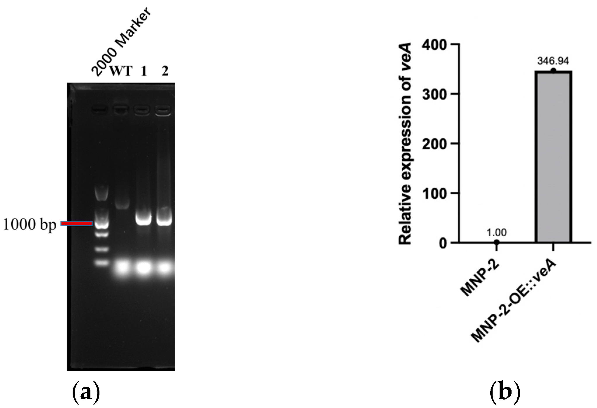 | OE::veA | 22.5559 | β-actin | 23.3631 | −0.81 | −8.44 |