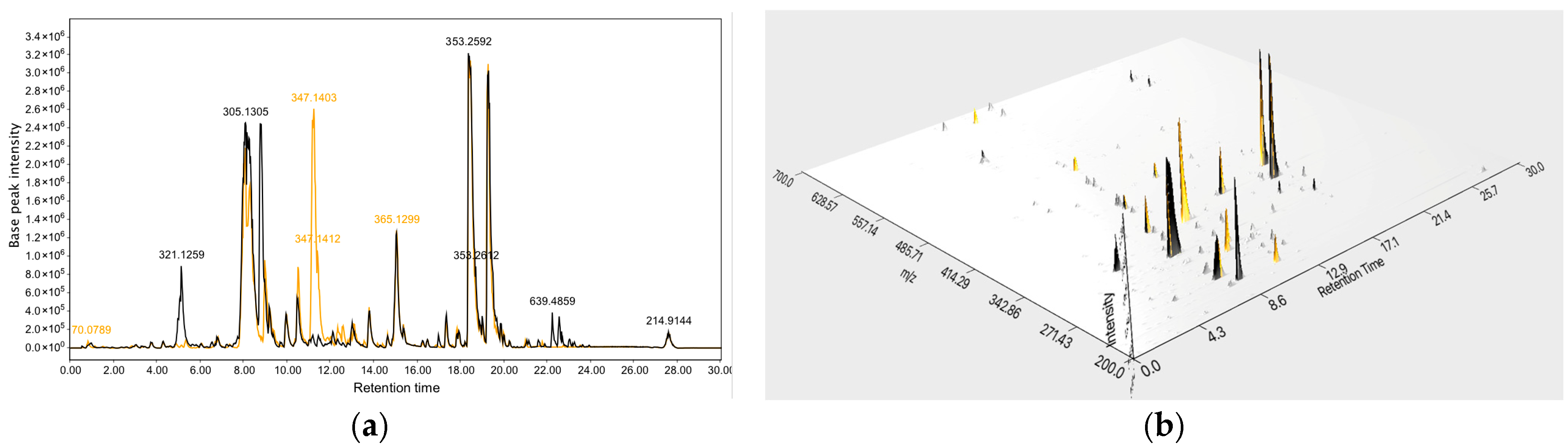 3.4. Liquid Chromatography–Mass Spectrometry Analysis
