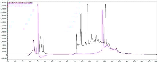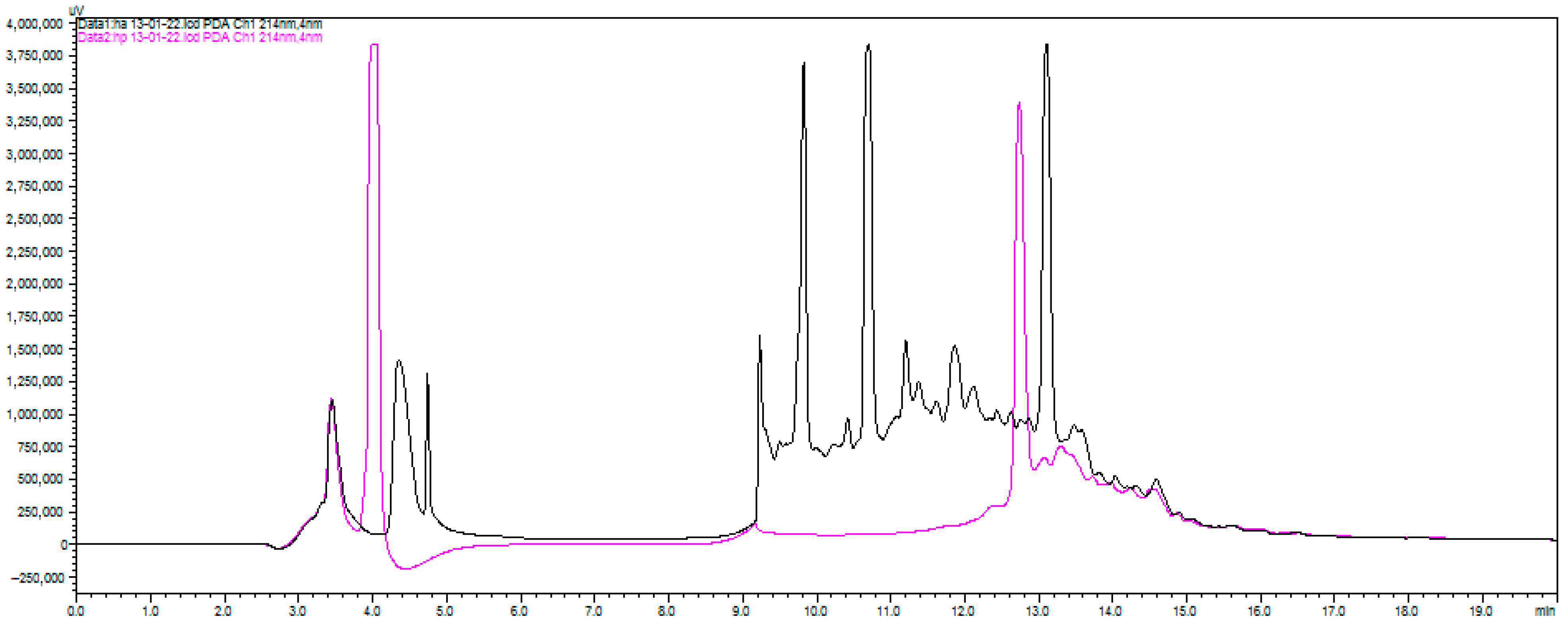 Chromatographic profile of the Hepatus pudibundus sample subjected to hydrolysis with Alcalase (black) and Protamex (pink).