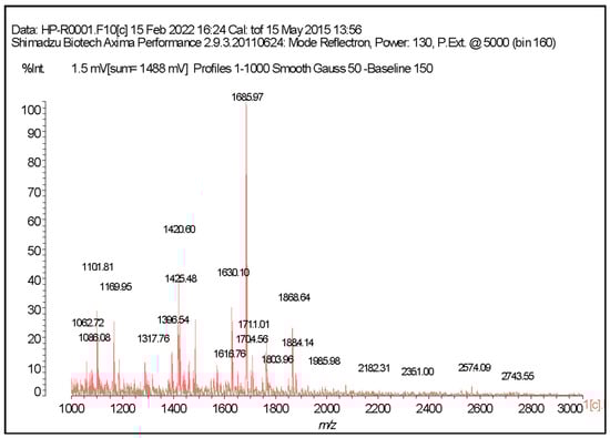 MALDI-TOF (Supplementary Materials—SM8–13) analysis revealed three major mass ranges: 1000–1500 Da, 1500–2000 Da, and 2000–3000 Da. The most abundant region corresponded to 1500–2000 Da, but substantial peptide signals were also observed in the adjacent ranges. Figure 2 shows the MALDI-TOF mass spectrum obtained from the Alcalase-hydrolyzed sample of Hepatus pudibundus (HPA).