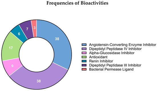 The frequencies shown in Figure 3 therefore represent the number of times each predicted bioactivity was annotated across all analyzed peptides. Angiotensin-converting enzyme (ACE) inhibitory peptides were identified when the sequences matched BIOPEP-UWM entries classified under the “ACE inhibitory peptides” category, following the database’s established annotation criteria. All peptide-activity assignments were extracted directly from BIOPEP-UWM outputs, and only activities supported by the database were included in the final frequency distribution.