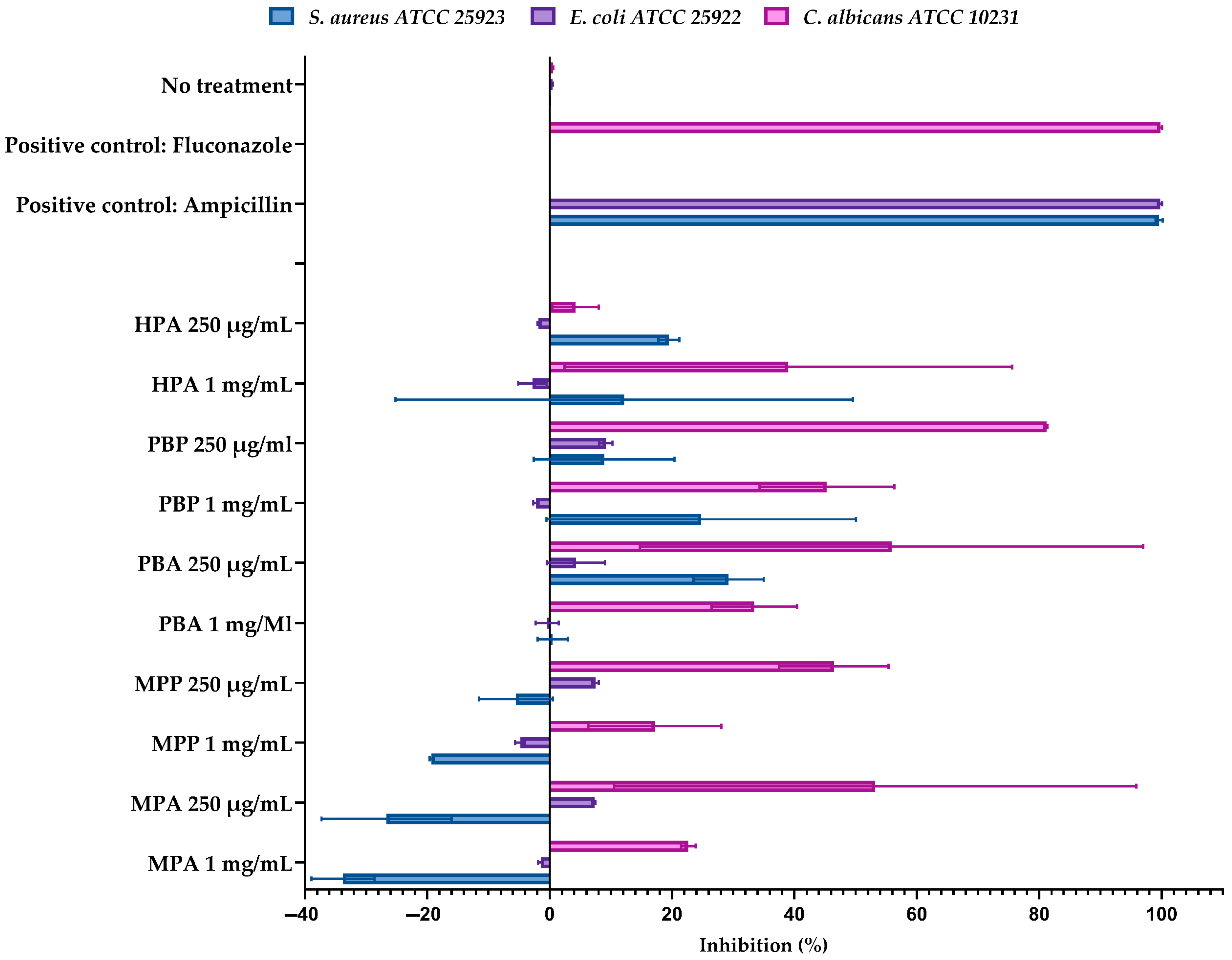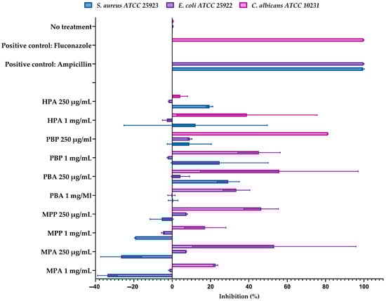 All tested microorganisms presented 100% of inhibition to positive controls: ampicillin at 2 µg/mL for bacteria and fluconazole at 1 µg/mL for C. albicans (Figure 5). Given the exploratory nature of this screening and the use of duplicate measurements (n = 2), no inferential statistical analysis was performed. Variability among replicates is presented as mean and standard deviation (SD) to illustrate experimental dispersion. The corresponding raw inhibition values for all assays are provided in Supplementary Materials (SM45–46).