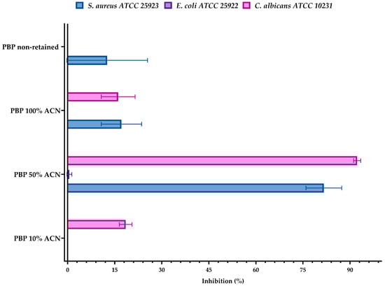 Antimicrobial activity of chromatographic fractions obtained from Paralonchurus brasiliensis Protamex hydrolysate (PBP) following RP–HPLC separation. Fractions included the non-retained fraction and those eluted with 10%, 50%, and 100% acetonitrile (ACN). Assays were performed against Staphylococcus aureus ATCC 25923, Escherichia coli ATCC 25922, and Candida albicans ATCC 10231 in duplicate (n = 2), following the general principles of CLSI guidelines [11,12]. Results are expressed as mean percentage inhibition ± standard deviation (SD). Raw antimicrobial inhibition data for each fraction are available in the Supplementary Materials (SM45–46).