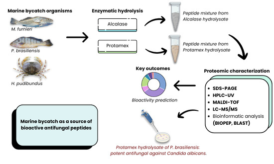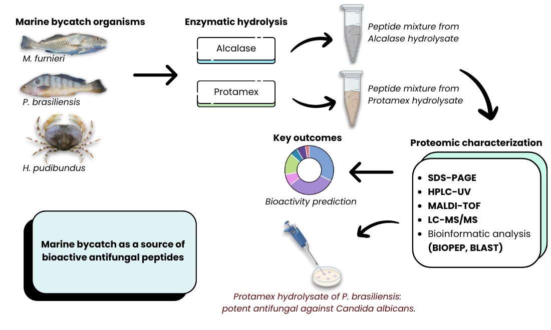 This study aims to bridge this gap by performing a deep proteomic and functional characterization of hydrolysates from three abundant bycatch species: the fish Paralonchurus brasiliensis and Micropogonias furnieri, and the crab Hepatus pudibundus. We hypothesized that enzymatic hydrolysis with Alcalase and Protamex would release a diverse array of bioactive peptides from these species, and the choice of enzyme would critically determine the functional profile of the resulting hydrolysates, leading to selective and potent antimicrobial activities. Our findings reveal a powerful and specific anti-Candida activity, demonstrating the immense biotechnological potential hidden within fisheries bycatch.