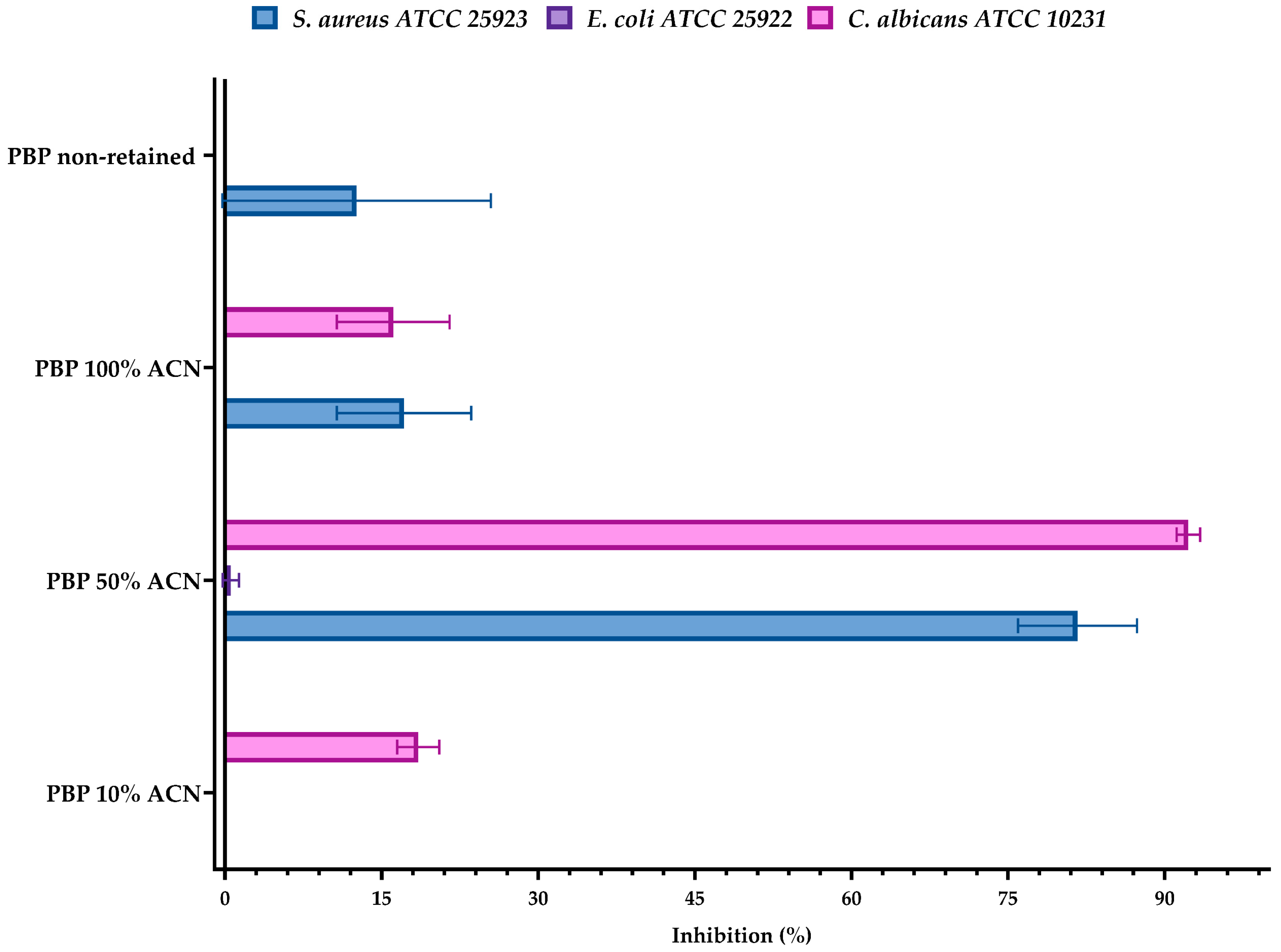 The fraction eluted at 100% ACN showed moderate inhibition against S. aureus (≈17%) and C. albicans (≈16%), with no detectable activity against E. coli. Similarly, the non-retained fraction exhibited low but measurable inhibition against S. aureus (≈13%) and C. albicans (≈16%), while E. coli remained largely unaffected. The individual inhibition values underlying these observations are reported in Supplementary Materials (SM45–46).