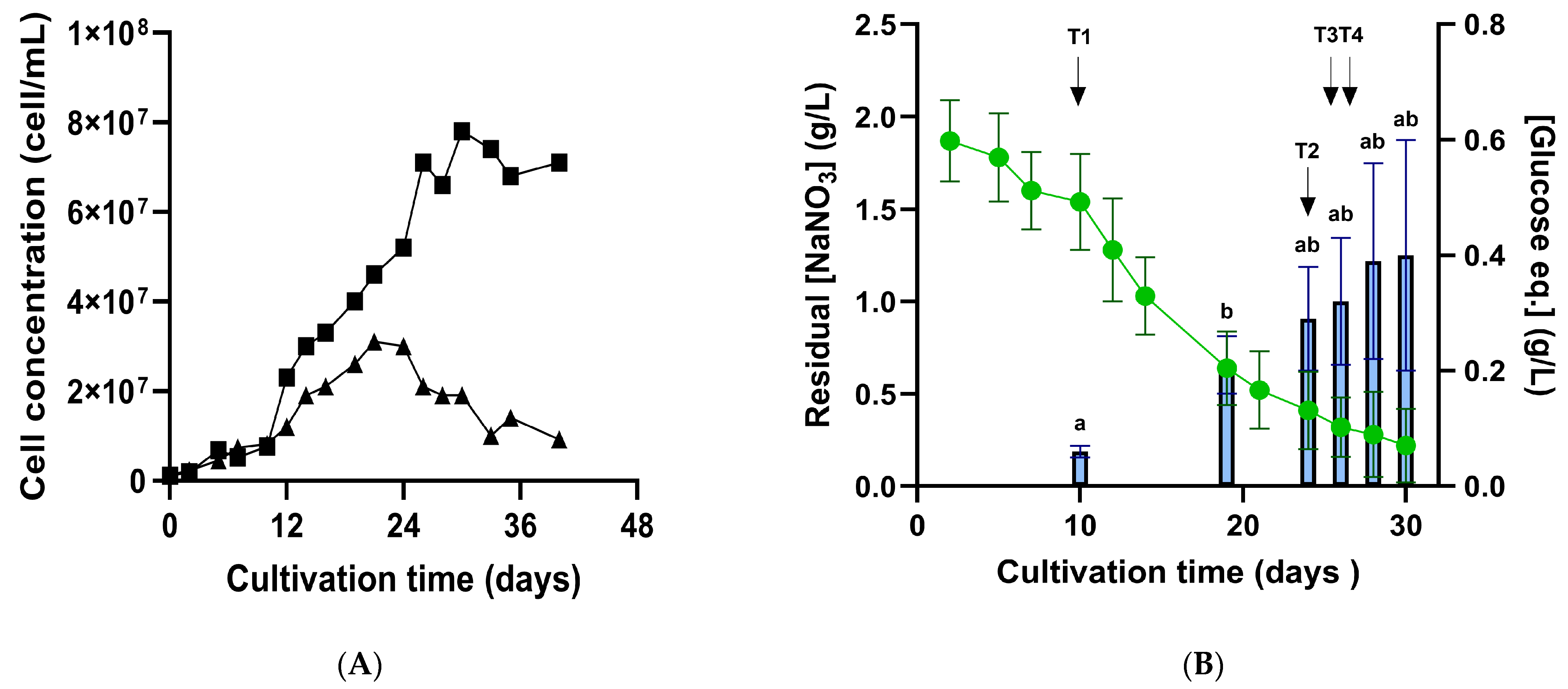 2.1. Significant Exopolysaccharide (EPS) Release Coincides with Nitrate Uptake Rate Decline, Hinting at Porphyridium purpureum Shift into Nitrogen-Limiting Conditions