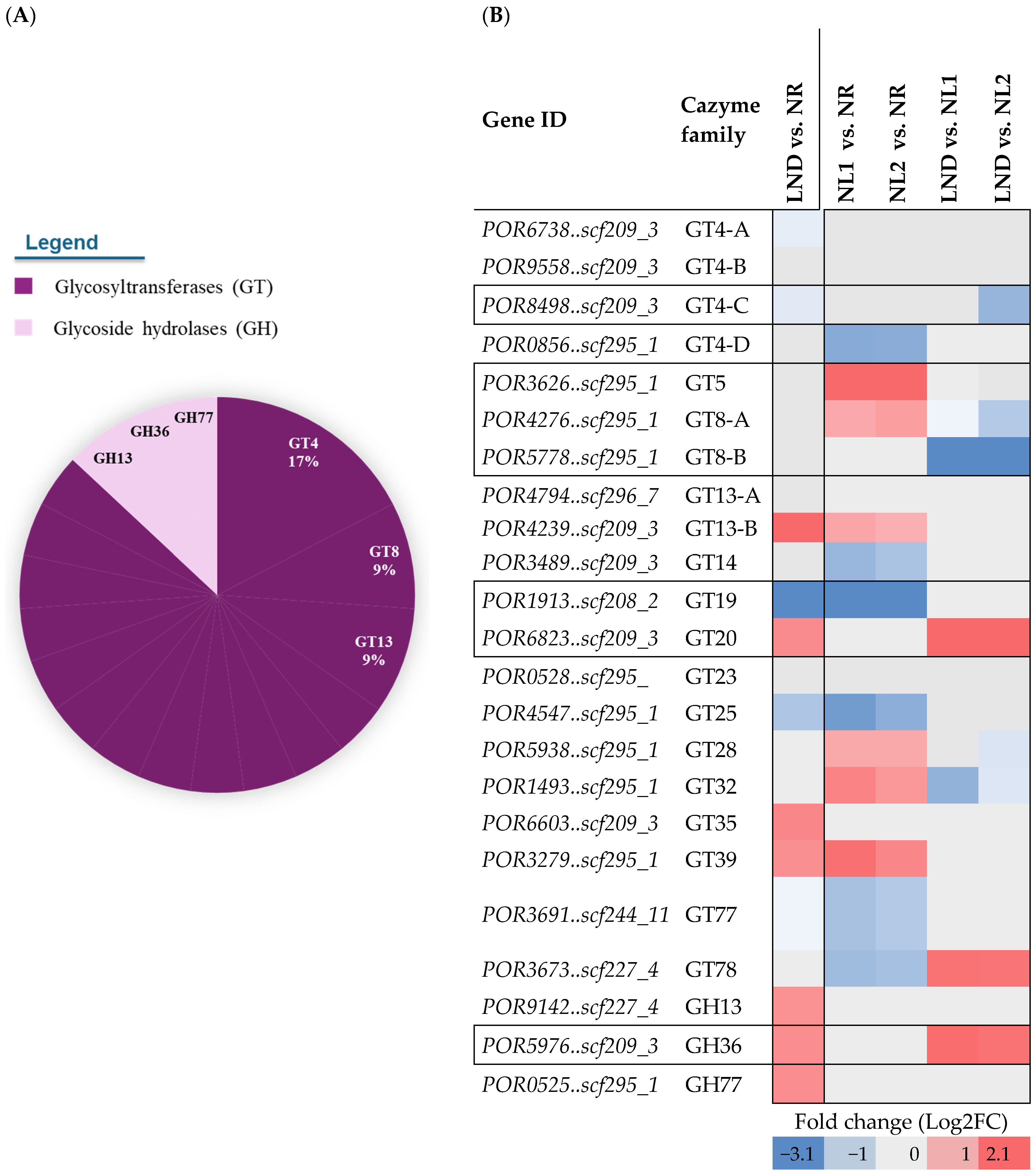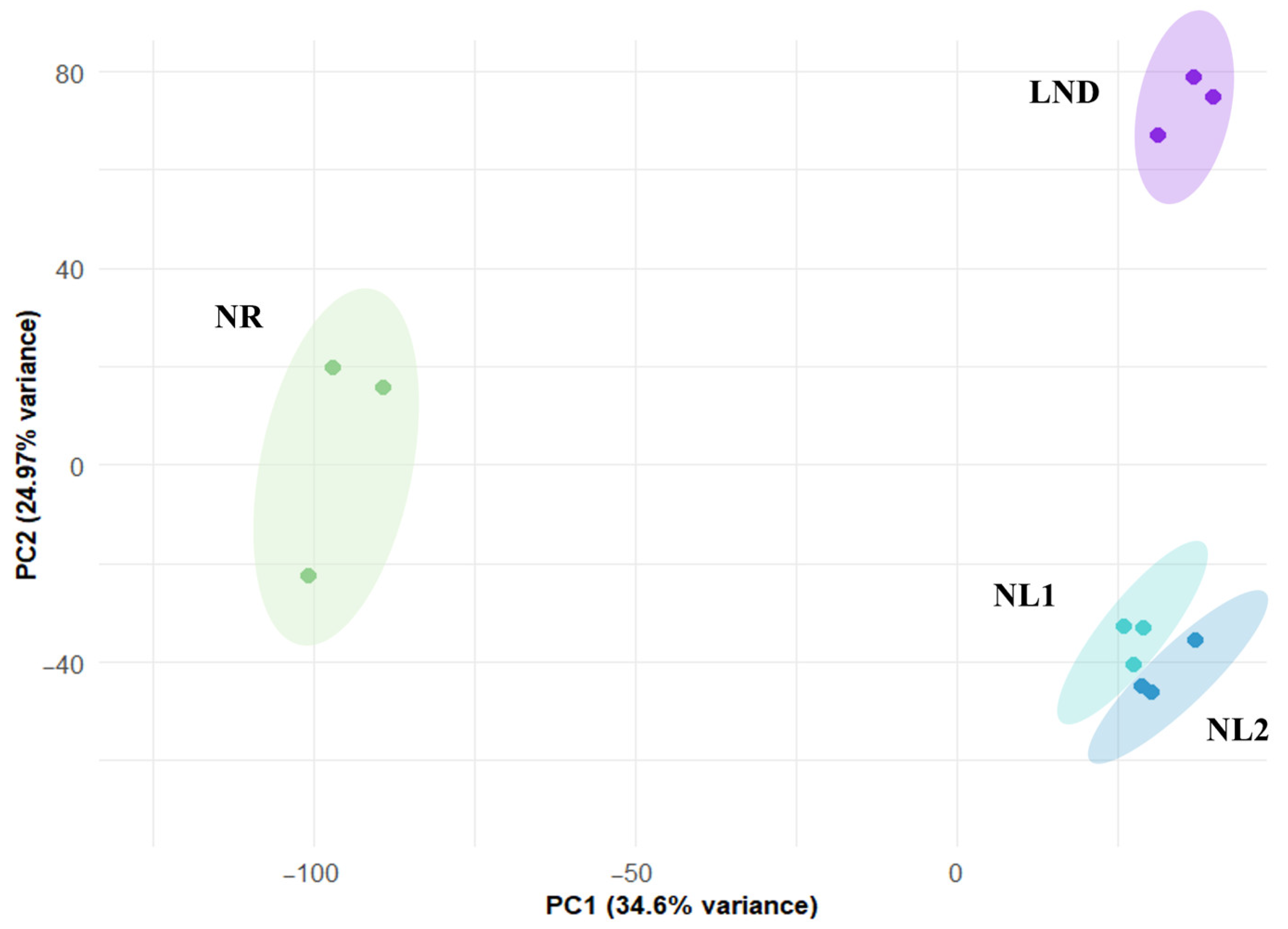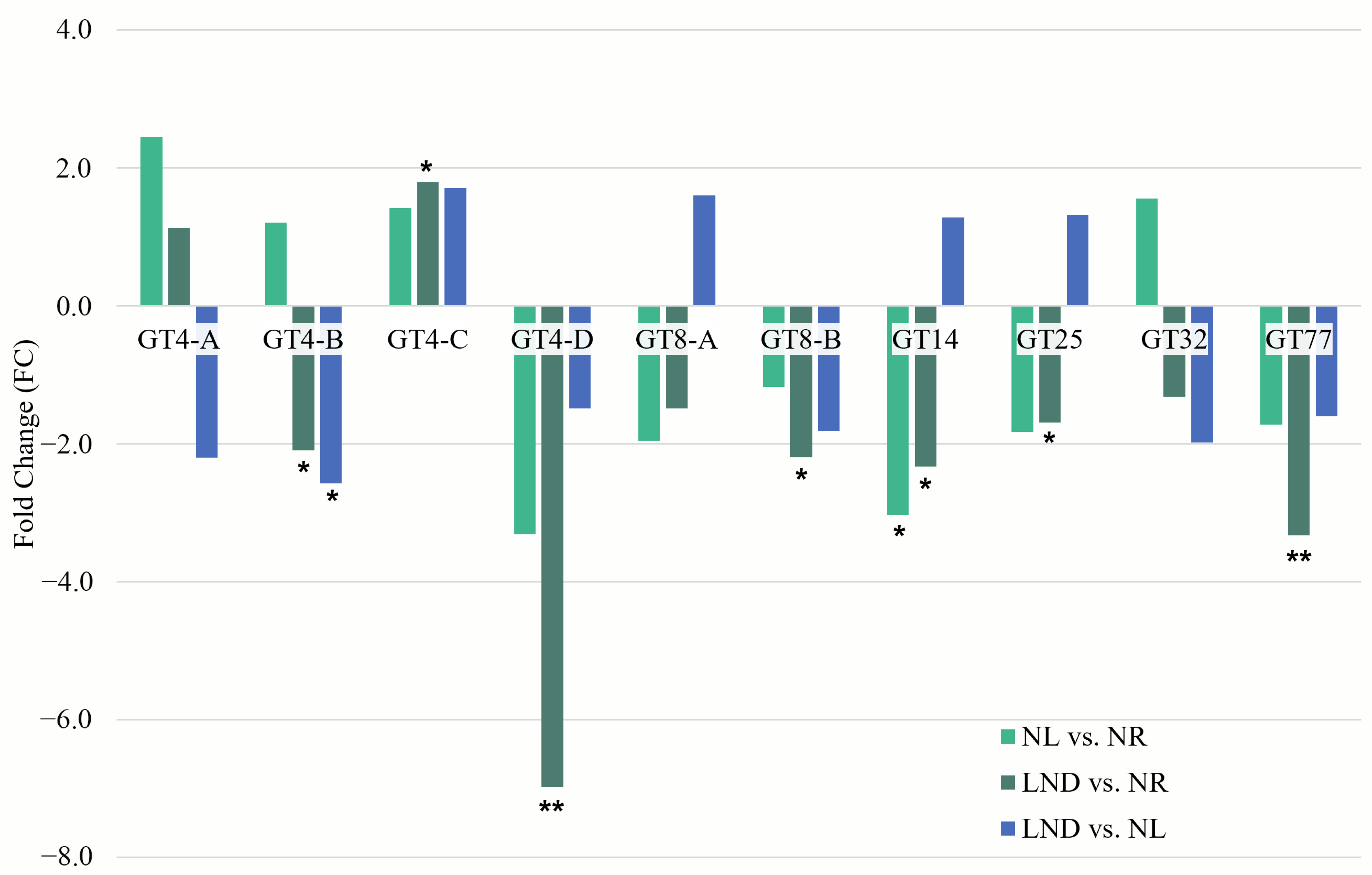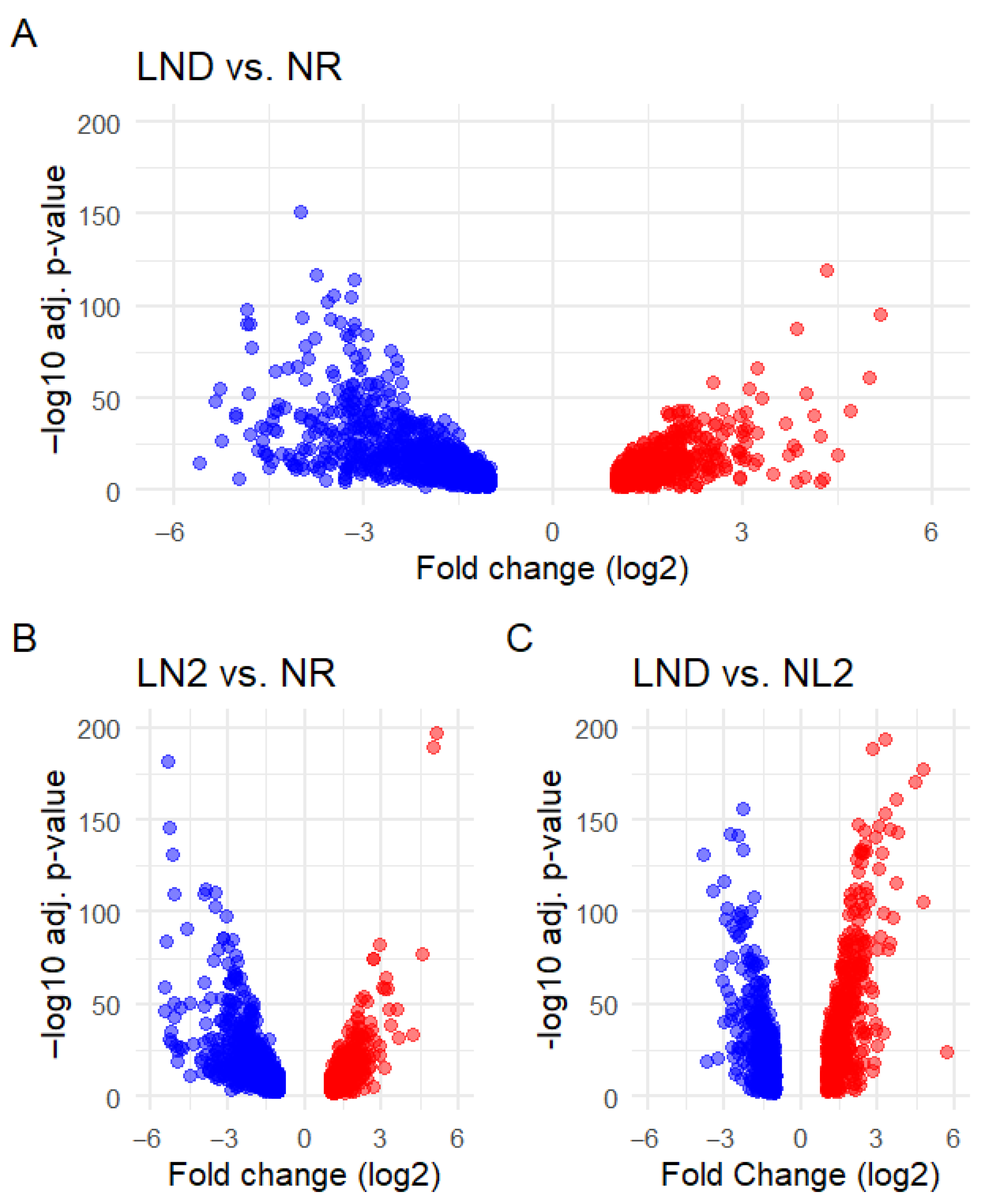 | Gene ID | Annotation (Abbreviation) | LND vs. NR | NL1 vs. NR | NL2 vs. NR | LND vs. NL1 | LND vs. NL2 |
