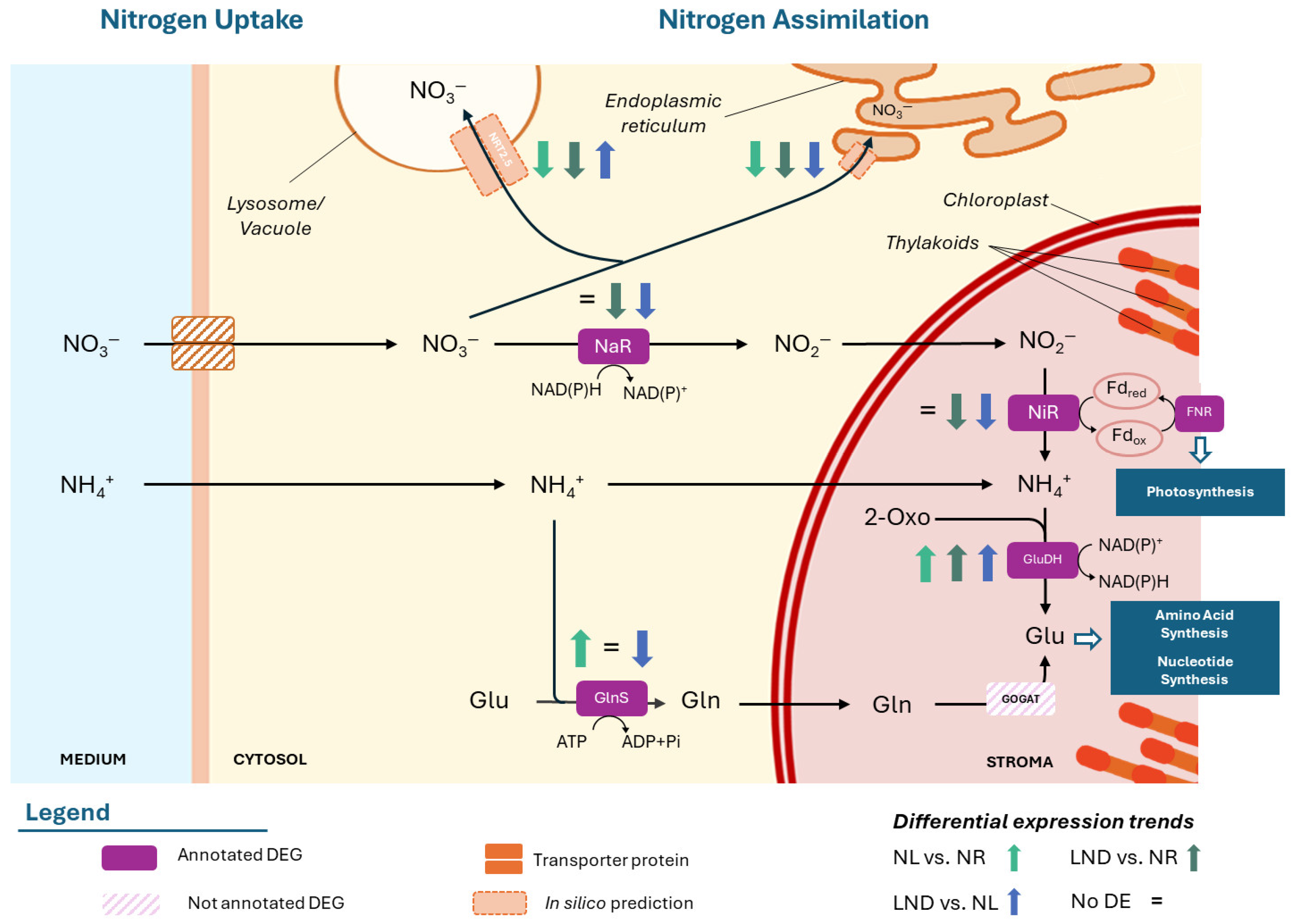 2.6. Nitrogen Metabolism Under Early Nitrogen Limitation Suggests a Phase- and Potential-Compartment-Specific Regulation in P. purpureum