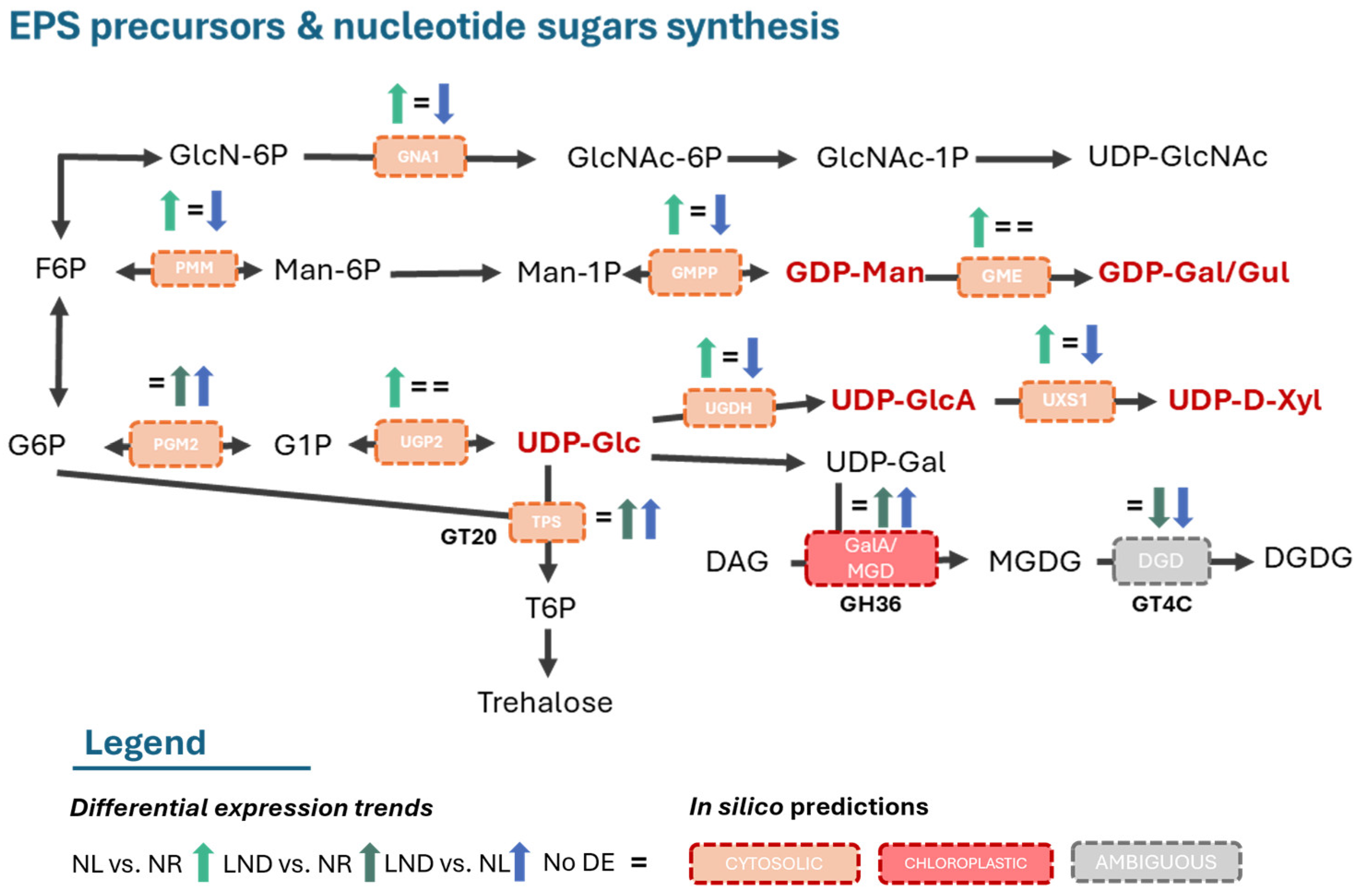 2.8. Concerted Regulation of Nucleotide–Sugar Synthesis and CAZyme-Related Pathways Supports Early Polysaccharide and Glycoprotein Assembly Under Nitrogen Stress