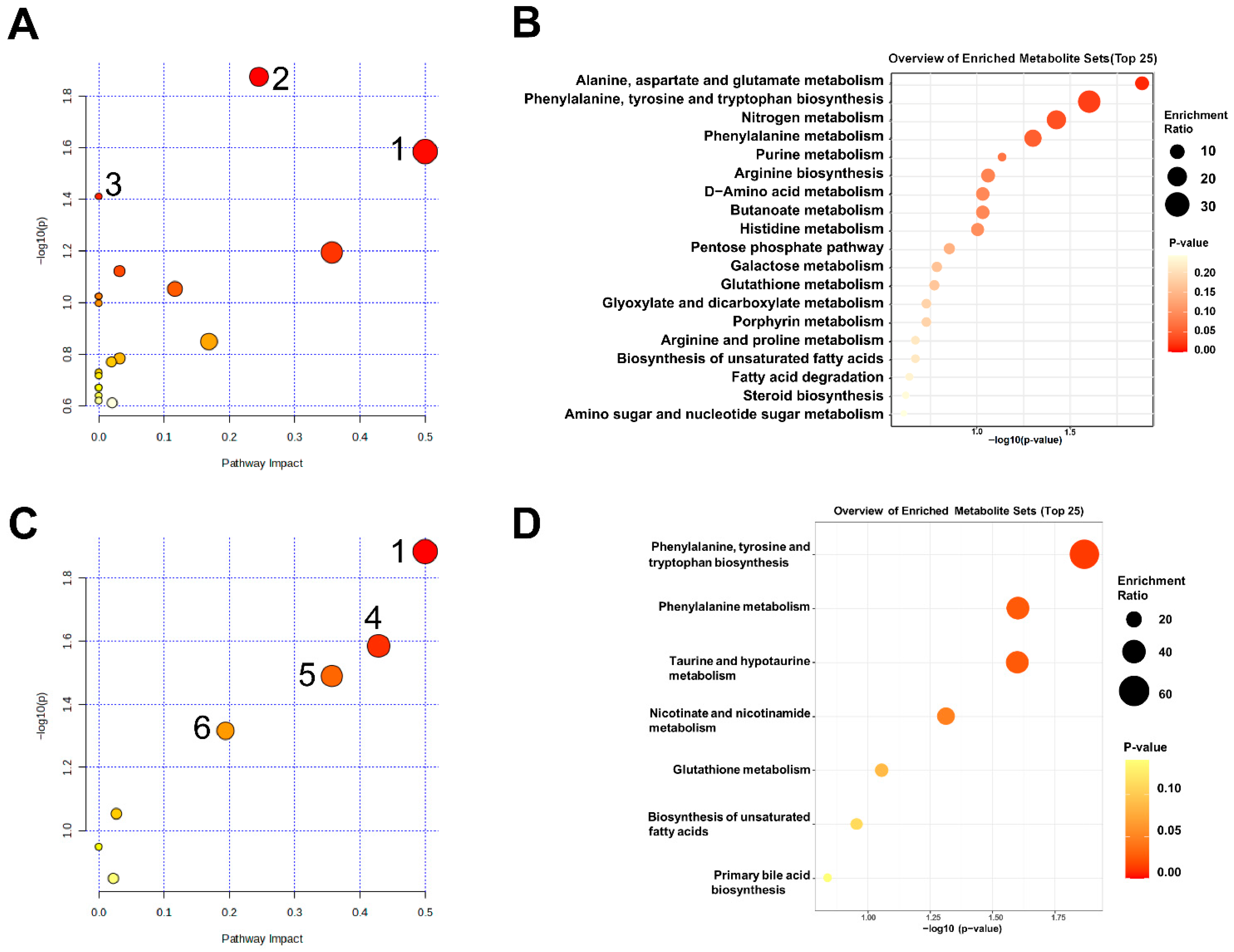 | 15 | L-Norleucine | [M + H]+ | 0.80 | 1.72 | 4.37 × 10−2 | — | ↓ | ↑ |