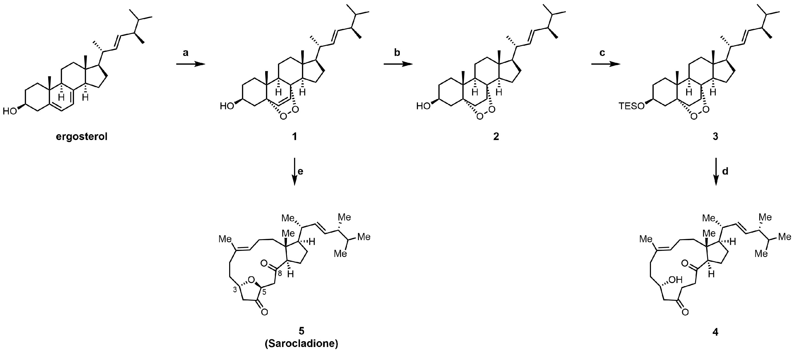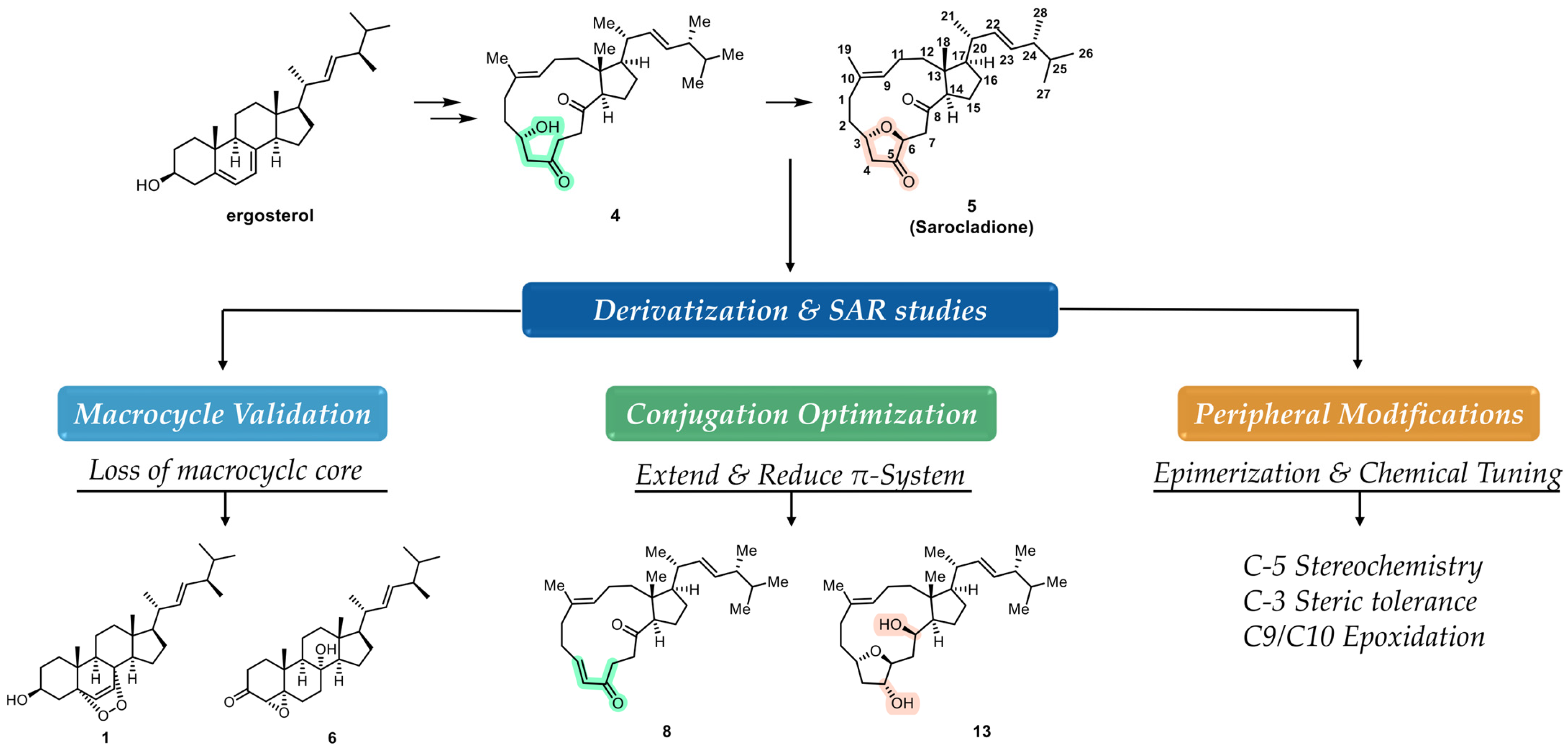- Duecker, F.L.; Reuß, F.; Heretsch, P. Rearranged Ergostane-Type Natural Products: Chemistry, Biology, and Medicinal Aspects. Org. Biomol. Chem. 2019, 17, 1624–1633. [Google Scholar] [CrossRef]