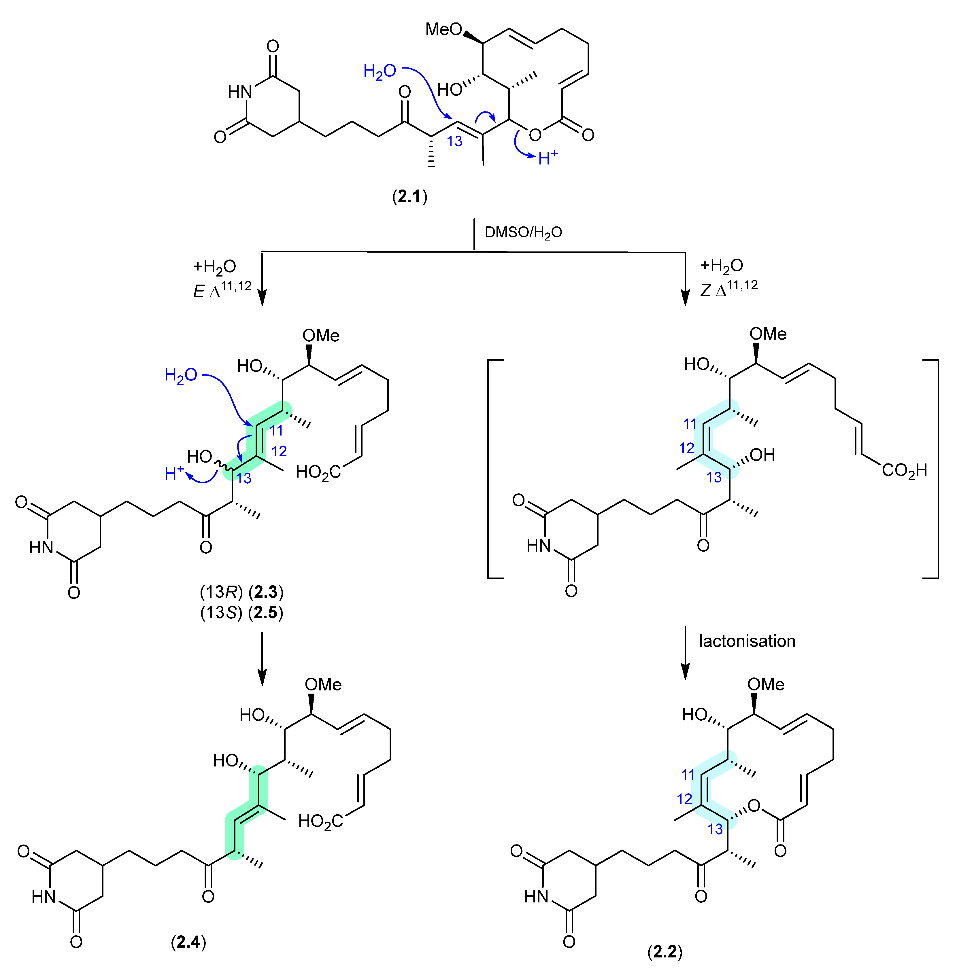 2O addition to C-13 with concomitant double bond migration and opening of the macrolactone to generate