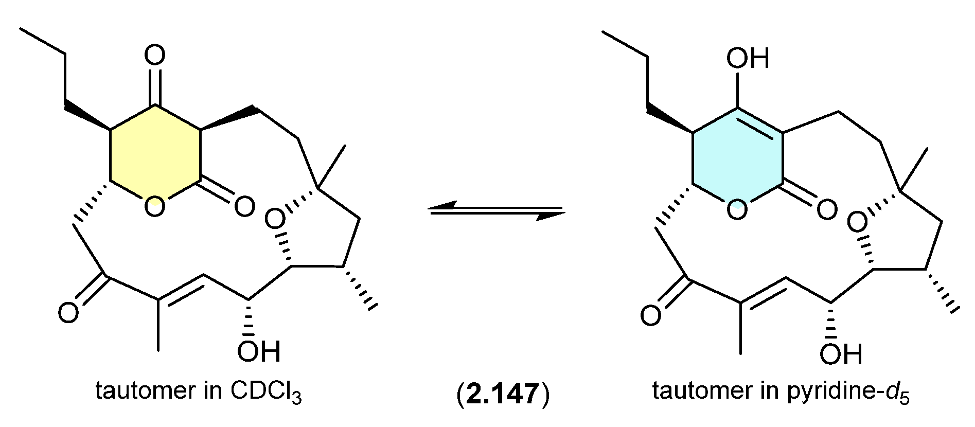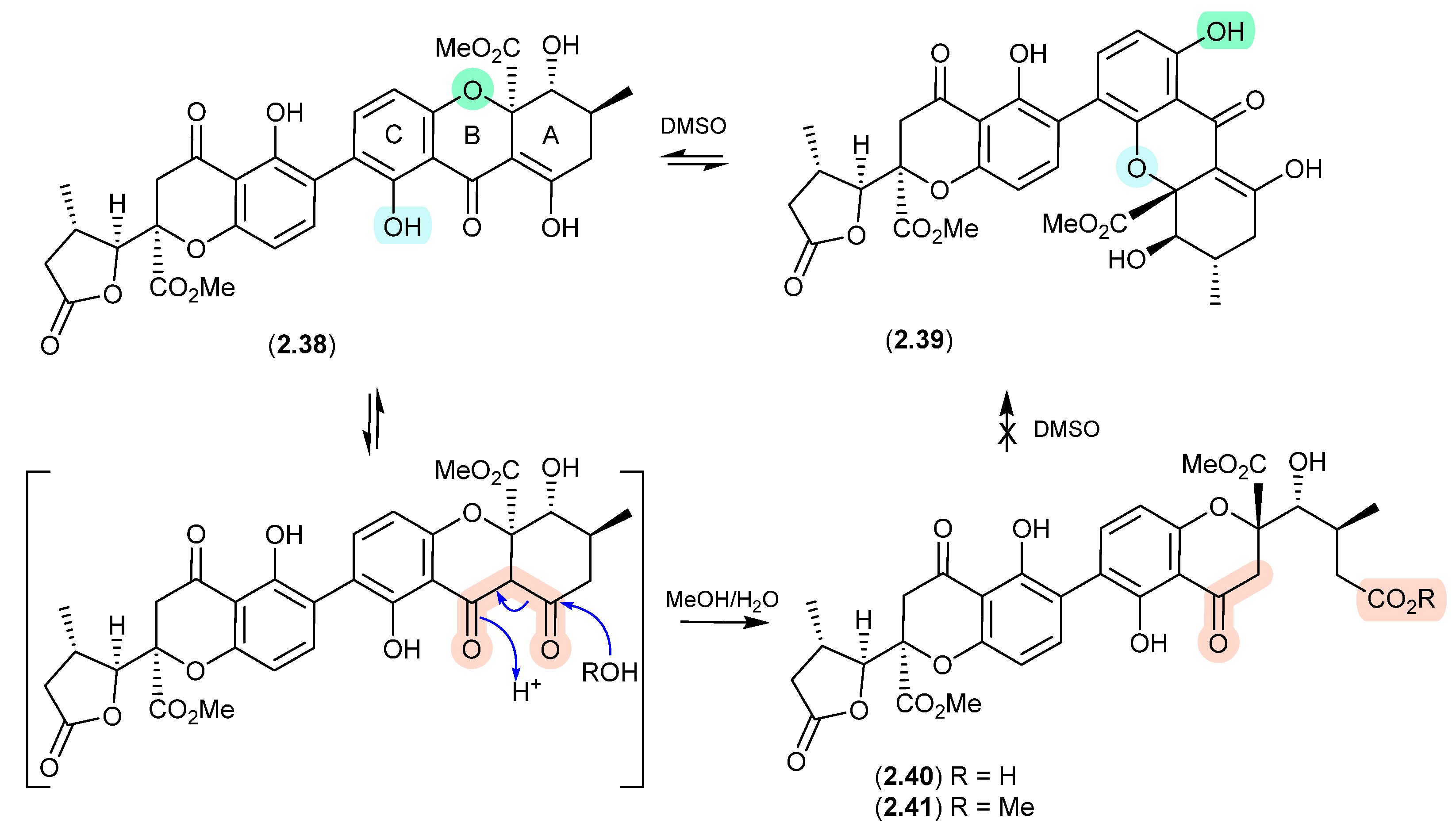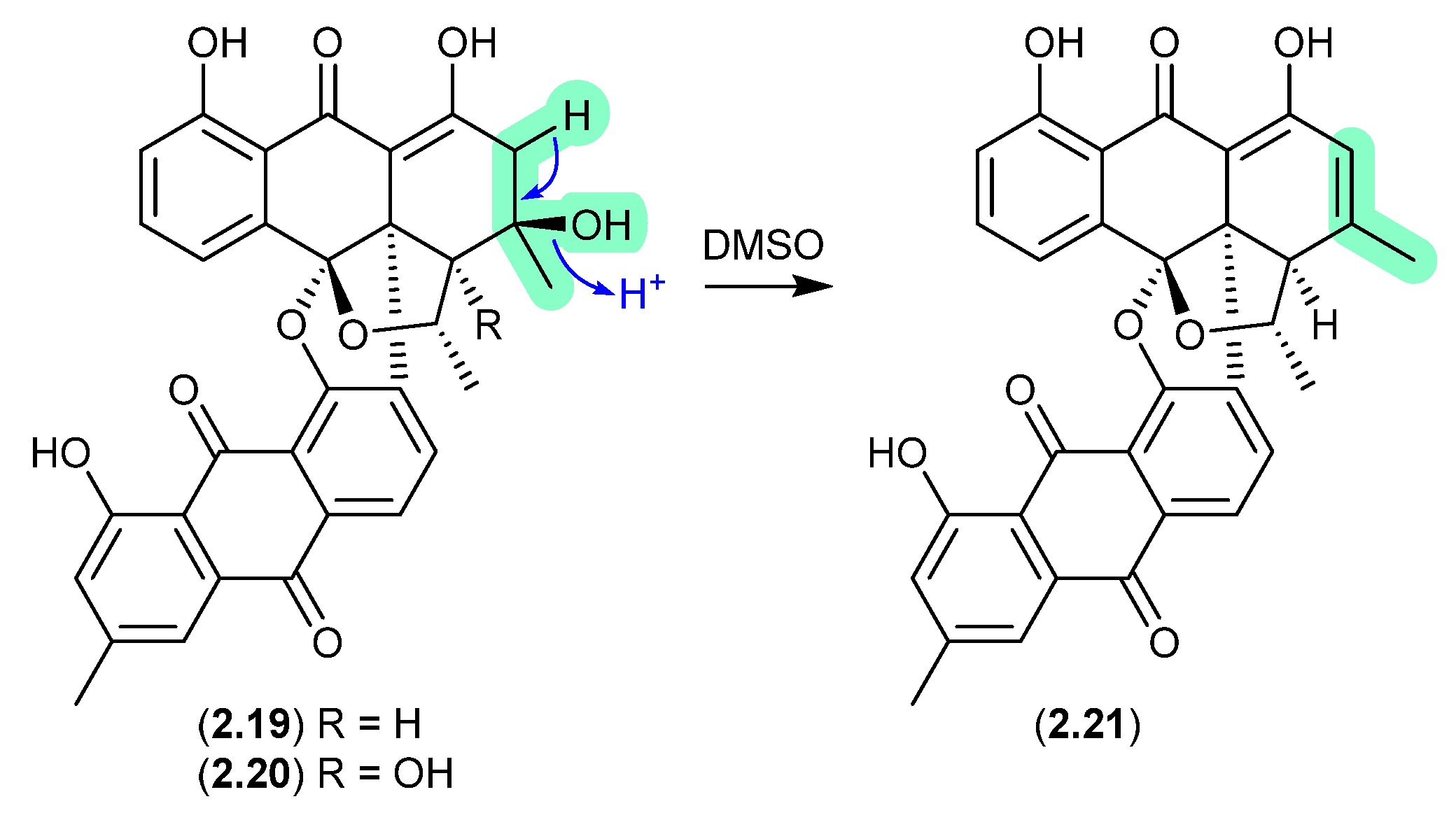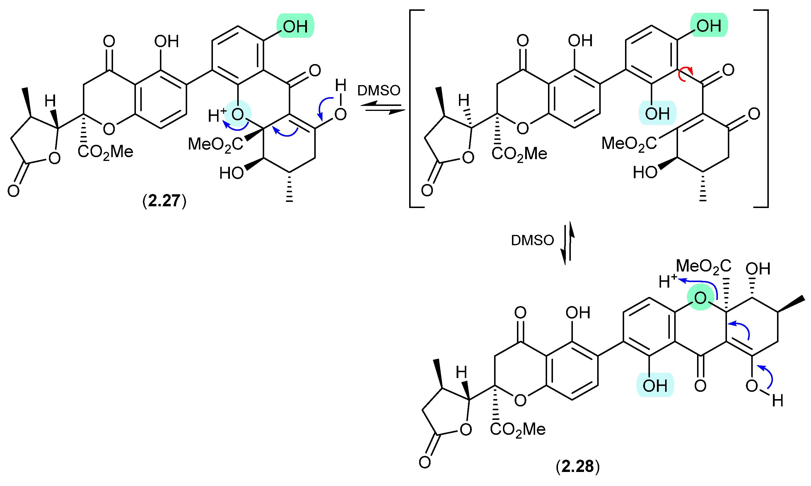NMR data acquisition—The acquisition of NMR data can take many hours, during which time natural products are exposed to deuterated solvents at r.t. or above. While all the concerns noted above for solvent use in extraction and chromatography apply, it is noteworthy that virtually all NMR solvents have the potential to facilitate artifact formation. Perhaps the only cautionary advice we can offer is to minimise exposure, store samples in the dark at a reduced temperature (~4 °C to avoid freezing and sample precipitation) and avoid exposure to direct sunlight during handling. The same also applies to stored artifacts, as prolonged storage can facilitate further transformations. The authors have encountered cases where the time required to acquire a complete 1D and 2D NMR data set saw a natural product transform—partially or fully—into an artifact. In such cases the early NMR data is acquired on a compound different from the later acquired NMR data.