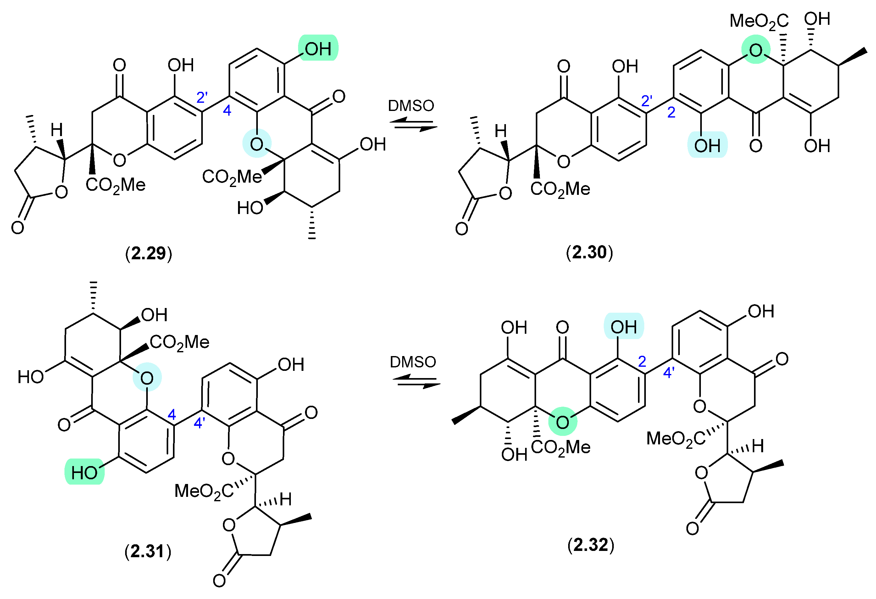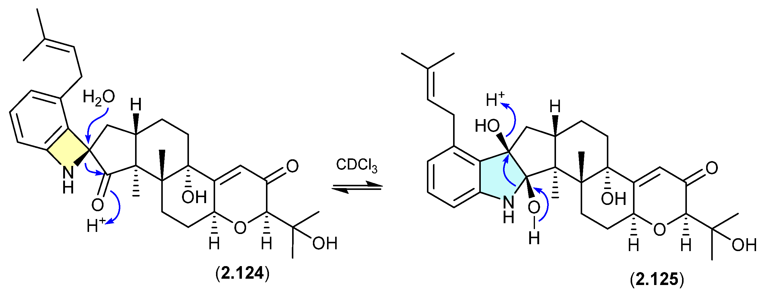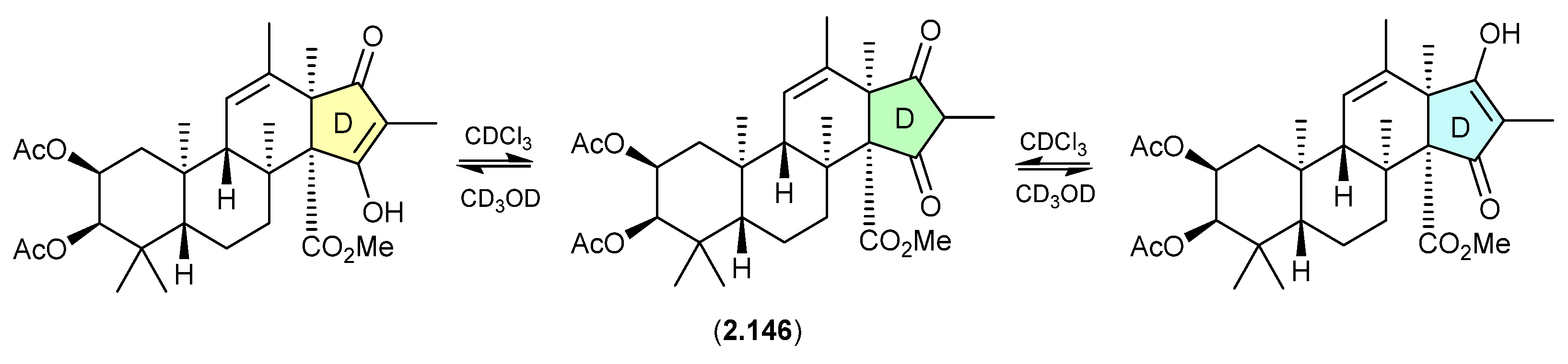 NMR data acquisition—The acquisition of NMR data can take many hours, during which time natural products are exposed to deuterated solvents at r.t. or above. While all the concerns noted above for solvent use in extraction and chromatography apply, it is noteworthy that virtually all NMR solvents have the potential to facilitate artifact formation. Perhaps the only cautionary advice we can offer is to minimise exposure, store samples in the dark at a reduced temperature (~4 °C to avoid freezing and sample precipitation) and avoid exposure to direct sunlight during handling. The same also applies to stored artifacts, as prolonged storage can facilitate further transformations. The authors have encountered cases where the time required to acquire a complete 1D and 2D NMR data set saw a natural product transform—partially or fully—into an artifact. In such cases the early NMR data is acquired on a compound different from the later acquired NMR data.