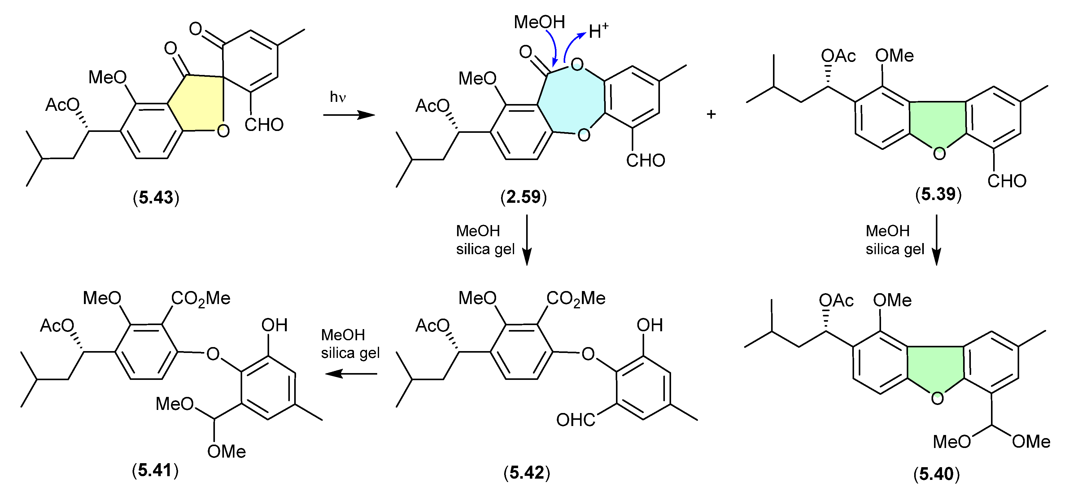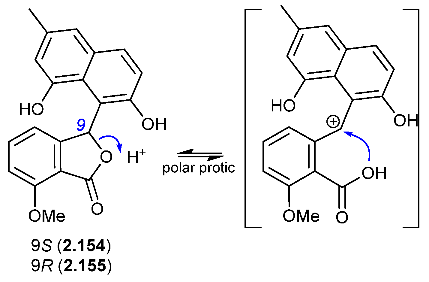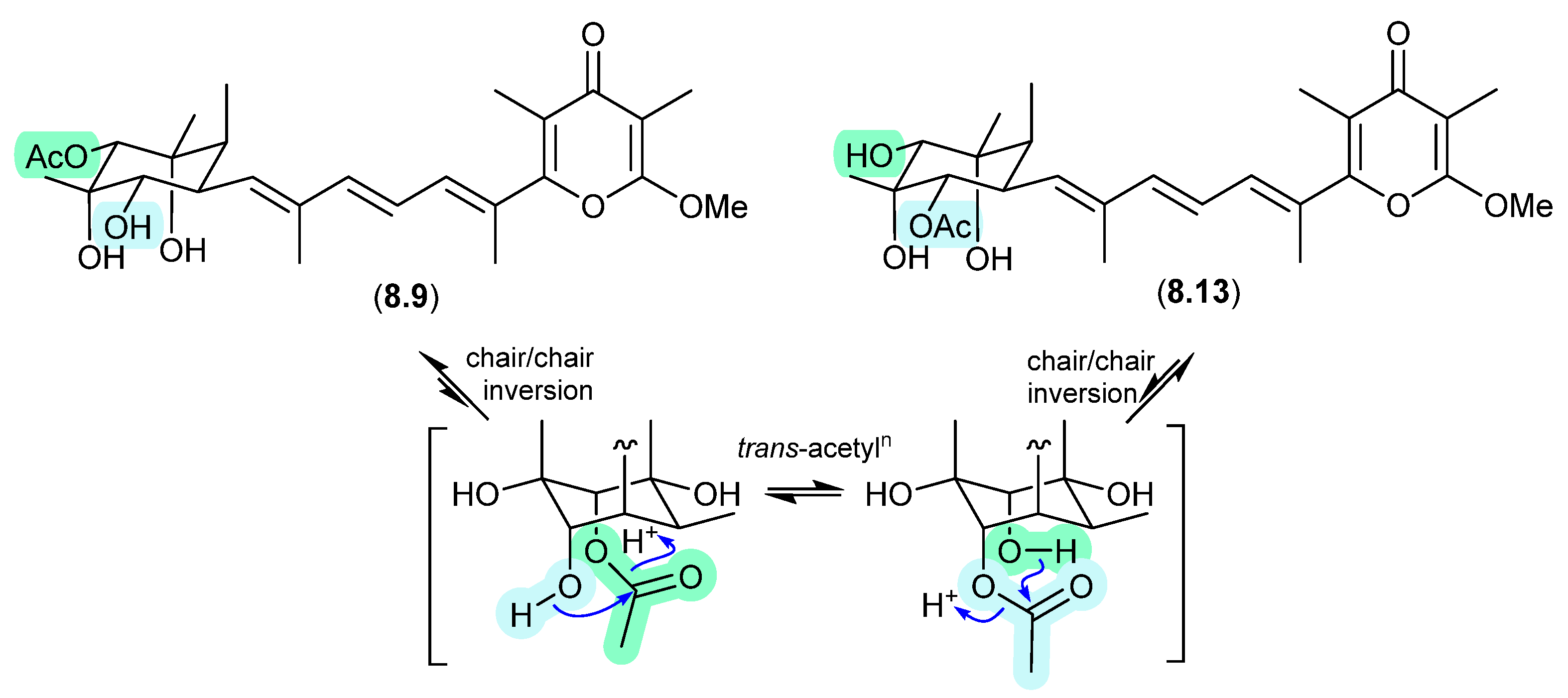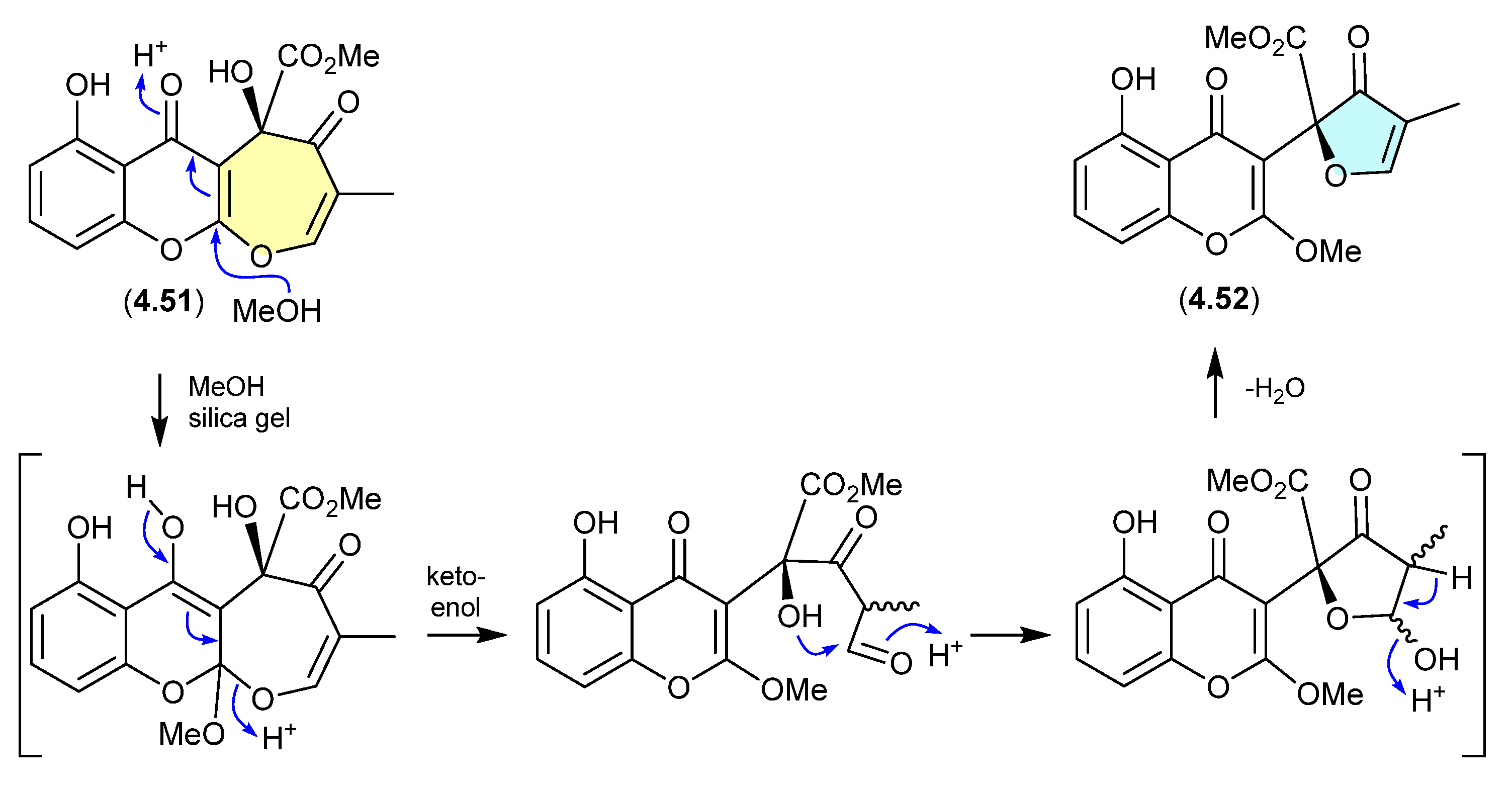 NMR data acquisition—The acquisition of NMR data can take many hours, during which time natural products are exposed to deuterated solvents at r.t. or above. While all the concerns noted above for solvent use in extraction and chromatography apply, it is noteworthy that virtually all NMR solvents have the potential to facilitate artifact formation. Perhaps the only cautionary advice we can offer is to minimise exposure, store samples in the dark at a reduced temperature (~4 °C to avoid freezing and sample precipitation) and avoid exposure to direct sunlight during handling. The same also applies to stored artifacts, as prolonged storage can facilitate further transformations. The authors have encountered cases where the time required to acquire a complete 1D and 2D NMR data set saw a natural product transform—partially or fully—into an artifact. In such cases the early NMR data is acquired on a compound different from the later acquired NMR data.