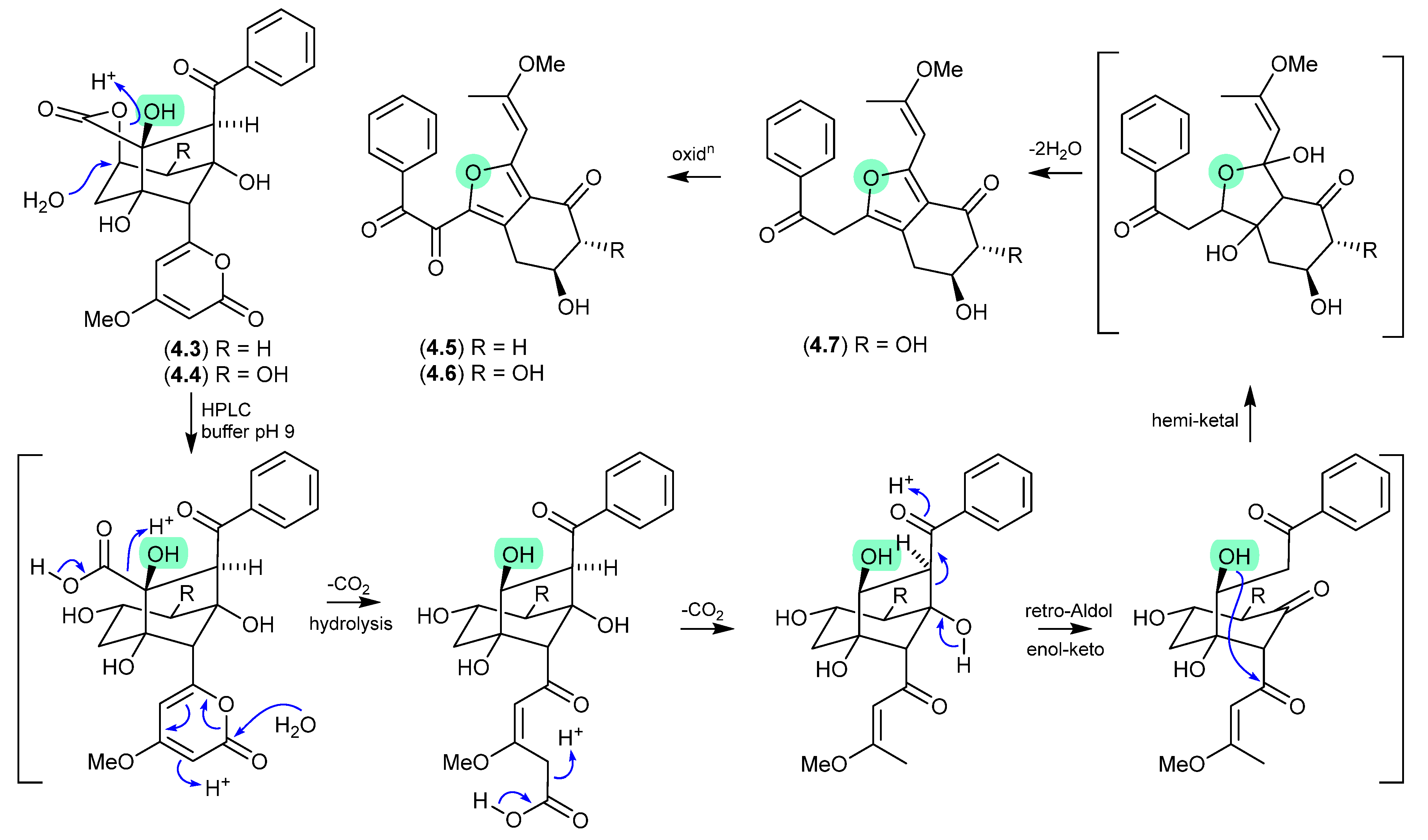 Storage artifacts—Once isolated and identified, samples of natural products (and artifacts) are typically stored either dry or in solution (e.g., DMSO) at low temperature in the dark. These samples can be recovered at a future date and used for further experiments (e.g., [α]D, bioassays). While tempting, it is risky to assume that these compounds survive storage intact. It is always prudent to perform a re-analysis (i.e., HPLC-MS) when accessing a stored sample to re-confirm its integrity.