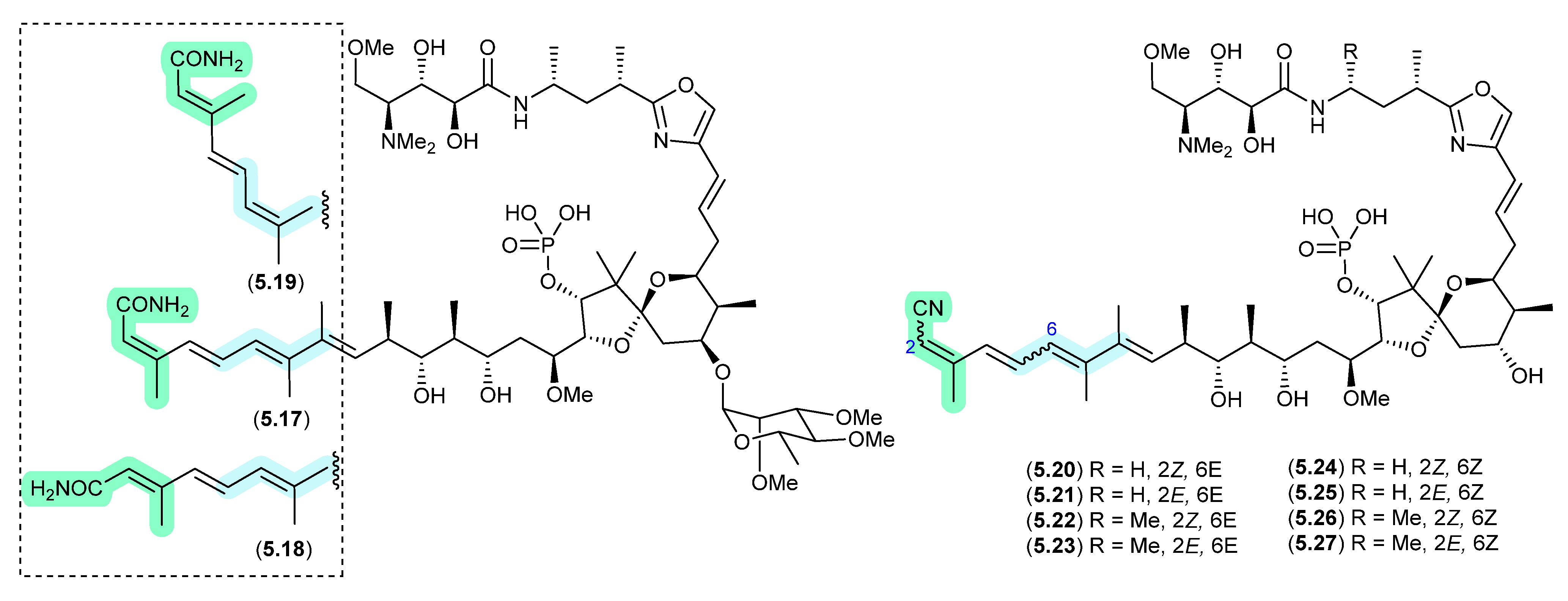 143]. This anti-tubercular activity was unexpected, as earlier SAR studies on the abyssomicin family had pointed to a pharmacophore dependent on an α,β-unsaturated ketone (i.e., a Michael acceptor) [