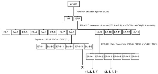 The epiphytic biomass was pulverized and extracted with MeOH:CH2Cl2, followed by liquid–liquid partitioning between ethyl acetate (EA) and water (W). Preliminary TLC and 1H NMR analyses indicated that the aqueous phase was dominated by sugars and salts. Consequently, the EtOAc phase, which contained the majority of the non-polar to semi-polar metabolites, was selected for further investigation. This fraction was subjected to vacuum liquid chromatography (VLC), yielding a total of 13 subfractions (EA-1 to EA-13).