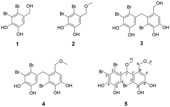 Bromophenols (1–5) isolated from the epiphytic biomass of Laminaria hyperborea. Compound 5 represents a new structure not previously reported in the literature.