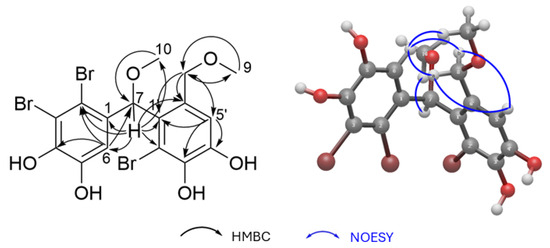The relative configuration of compound 5 was deduced from 1H–1H NOESY experiments. Strong correlations between H-6 and H-8a/H-8b, together with a weak one to H-9, indicate that H-6 is positioned on the same face as the alkyl chain of the opposite ring, with the bromine atoms oriented on the same side of the molecule. In contrast, the oxymethine proton H-7 and the methoxy protons H-10 showed strong mutual correlation only, placing them on the opposite face, away from the two aromatic planes (Figure S11). Key NOESY correlations and the proposed 3D configuration are illustrated in Figure 3.