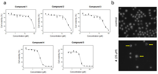 (a) Dose-response curve for compounds 1–5 against MOLM-13 leukemia cells after 48 h incubation. (b) Nuclear morphology of MOLM-13 cells. Cells were fixed and stained with the DNA dye Hoechst 33342 to visualize the nuclei. The upper image shows untreated cells, and the lower image shows cells treated with compound 4 at 25 μM concentration. The arrows indicate typical apoptotic nuclei. Images were acquired by fluorescence microscopy with a Nikon Diaphot 300 at 40× magnification.
